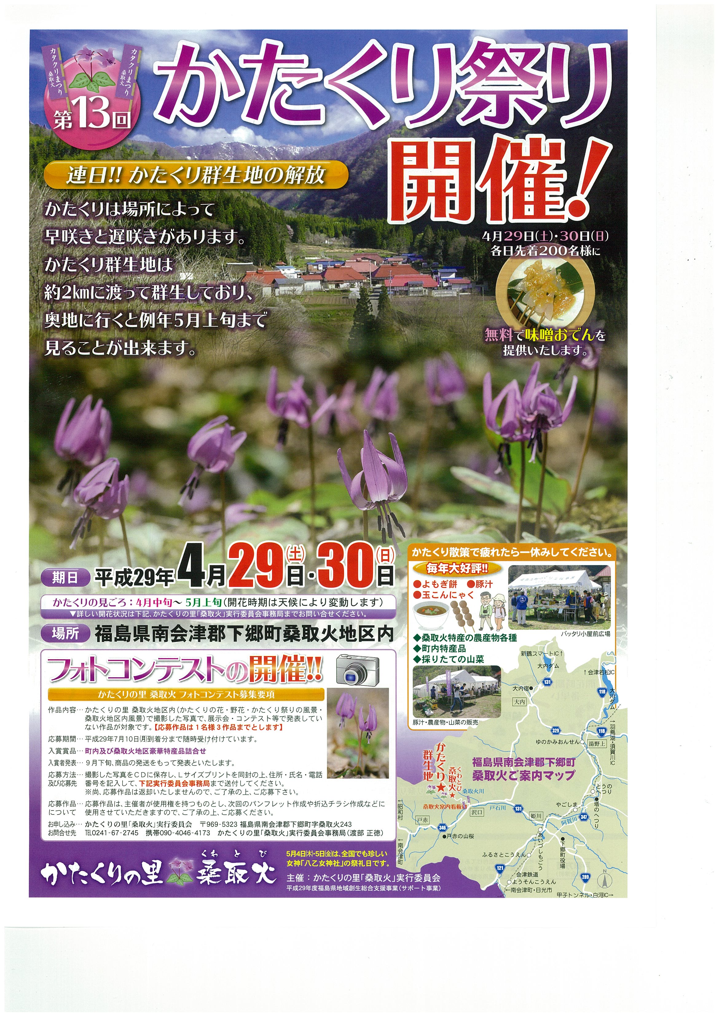 [PR] ×[PR]上記の広告は3ヶ月以上新規記事投稿のないブログに表示されています。新しい記事を書く事で広告が消えます。 かたくり祭りの開催について‼【平成29年4月29日(土)~30日(日)】 下郷町の桑取火地区では、毎年4月下旬に「かたくり祭り」を開催しています。 昨年は、暖冬のせいか4月10日頃には開花が始まり4月下旬には、ほとんど花が残っていませんでした。 今年は、ちょうどよさそうですが、フォトコンテスト応募の方は開花時期を確認して来てください。 また、4月29日(土)と4月30日(日)の2日間は、各先着200名様に昔懐かしい味噌おでんを無料で提供いたしますので、お早めにお越しください❢ [0回]PR コメント コメントを書く コメントを書く コメント送信