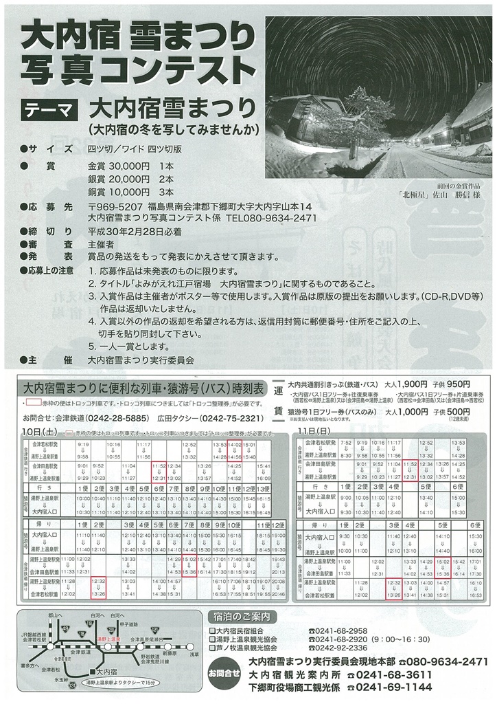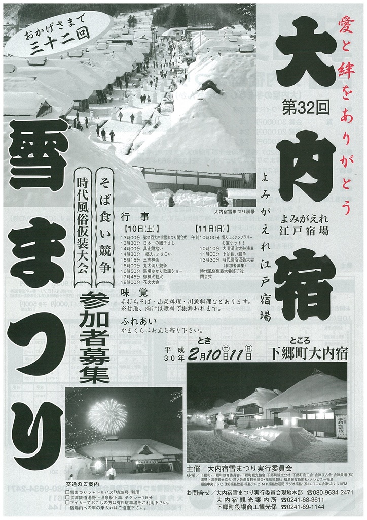 [PR] ×[PR]上記の広告は3ヶ月以上新規記事投稿のないブログに表示されています。新しい記事を書く事で広告が消えます。 第32回下郷町大内宿雪まつり2月10、11日開催 雪景色の大内宿そのものの美しさはもちろんですが、名物ねぎそばの早食い大会、時代風俗仮装行列などにくわえ、地域に伝わる「みかんまき」、「だんご刺し」などを楽しむことができます。1日目の夜は、綿帽子をかぶった宿場の街並みを鮮やかに照らし出す花火も必見です。 大内宿(国選定重要伝統的建造物群保存地区)は、江戸時代に会津若松城下と 今市宿を結ぶ 下野街道の宿場町として整備されました。 明治以降、鉄道や国道が大きく迂回したおかげで、昔ながらの景観が今に残り、四季を通して、昔と変わらぬ人々の暮しが息づいています。 [0回]PR コメント