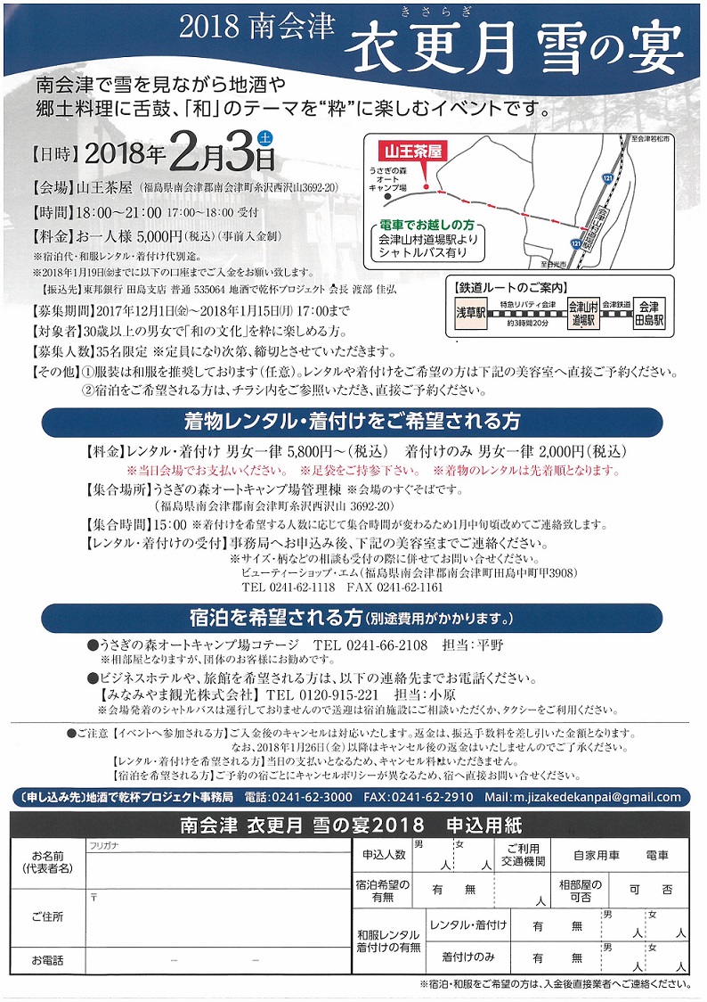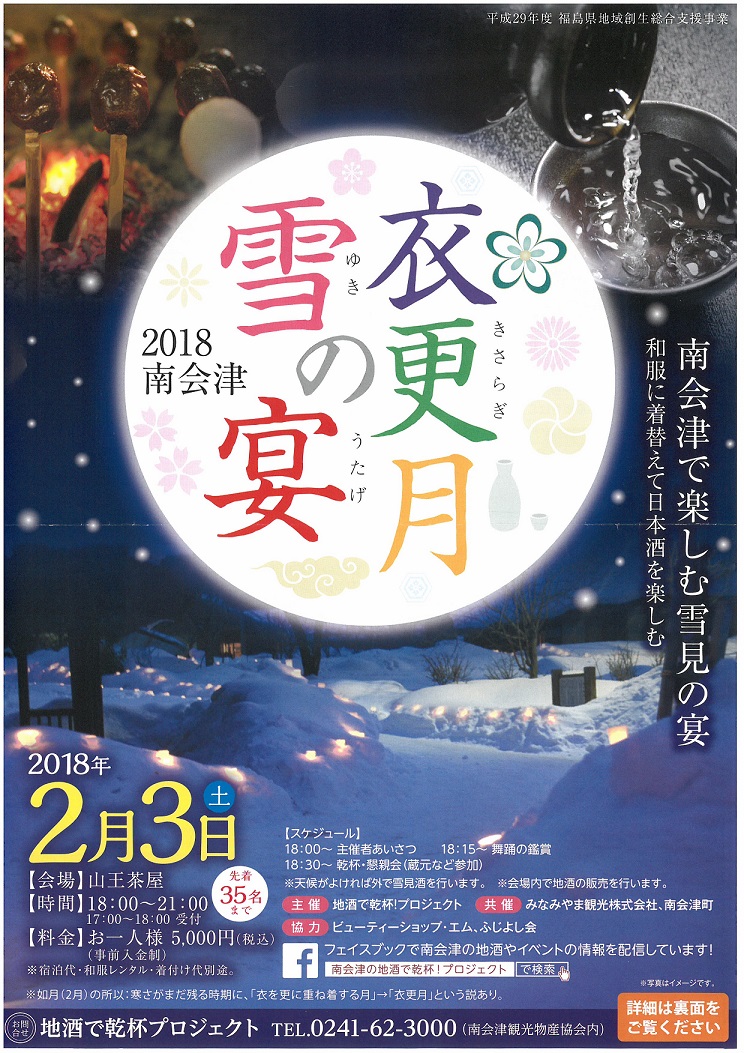 [PR] ×[PR]上記の広告は3ヶ月以上新規記事投稿のないブログに表示されています。新しい記事を書く事で広告が消えます。 本日も、頑張って行きましょう~!! 皆さん、こんにちは~ 2018年スタート、今年も、宜しくお願い致します~ きさらぎ ゆき うたげ 【衣更月 雪の宴】が、2月3日(土)に開催されます 会場が、山王茶屋 18:00~21:00まで行います~ 南会津で雪を見ながら地酒や郷土料理に舌鼓、「和」のテーマを ’粋"に楽しむイベントです 詳しい内容に付きましては、下記チラシをご覧下さいませ~ [0回]PR コメント