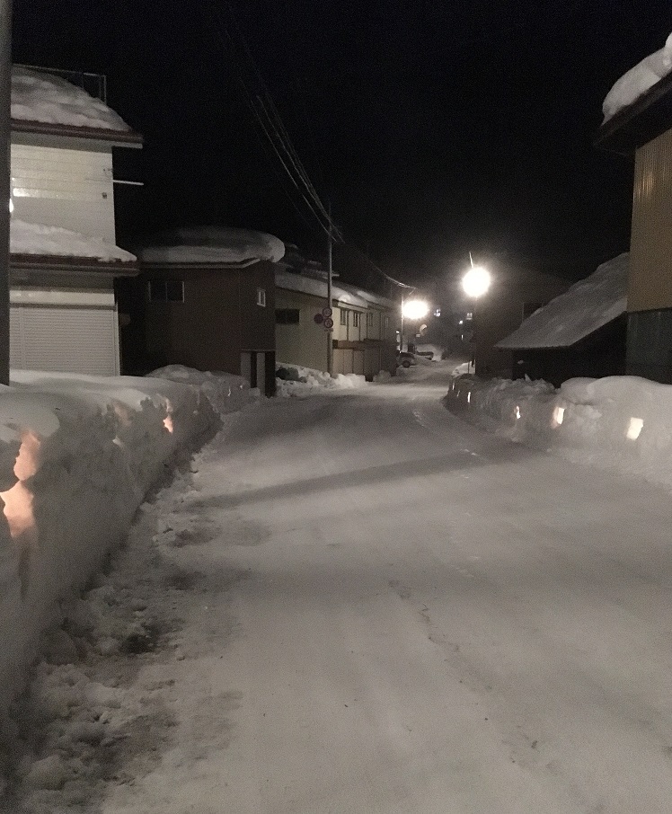 会場の周辺ではキャンドルが灯され、いつもとは違った幻想的な檜枝岐村の夜が楽しめました。また、会場では、甘酒やスルメ、豚汁などが振舞われ、来場された方は、冷えた身体を温め、談笑しながら、燃え盛る炎を見つめていました。