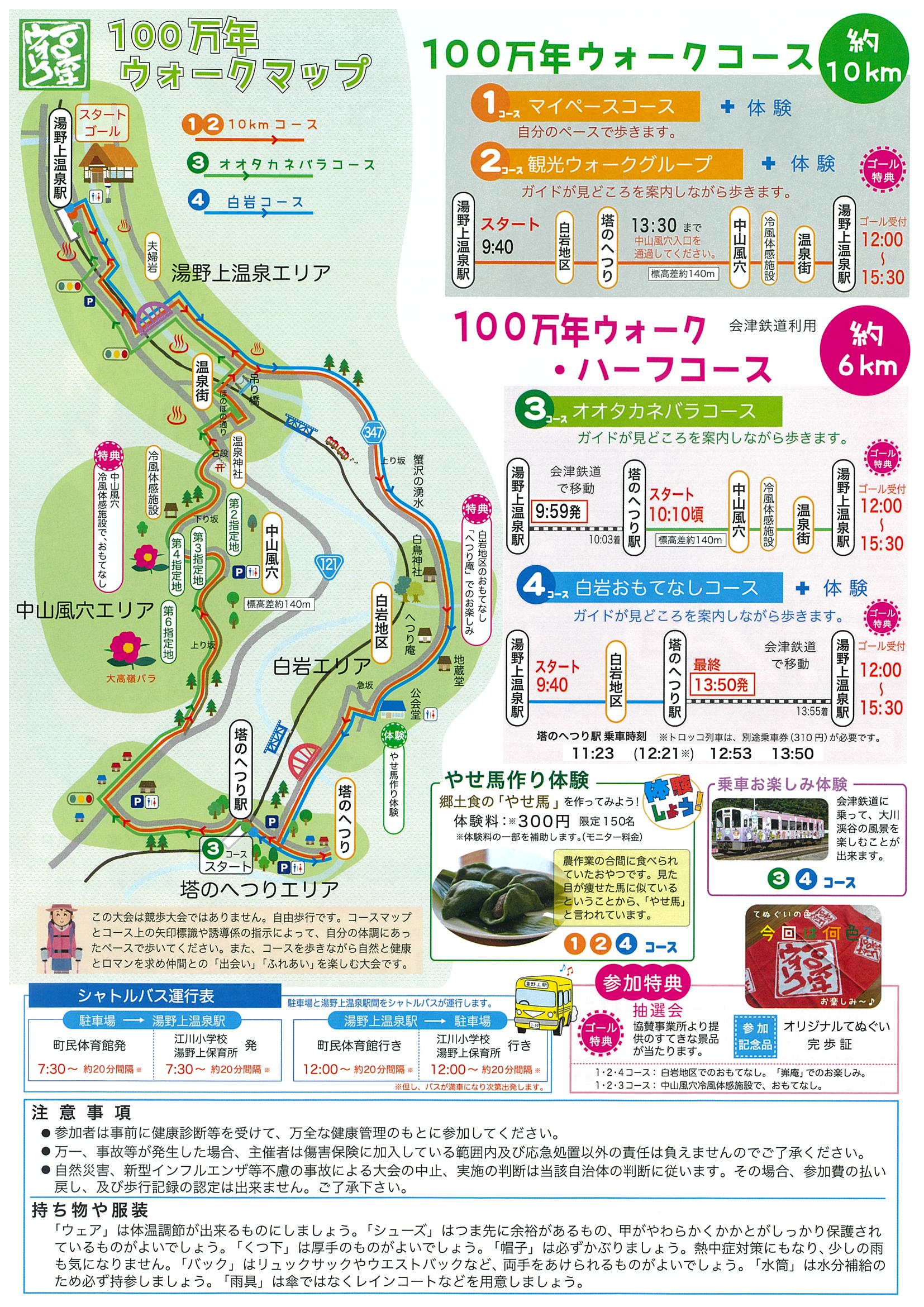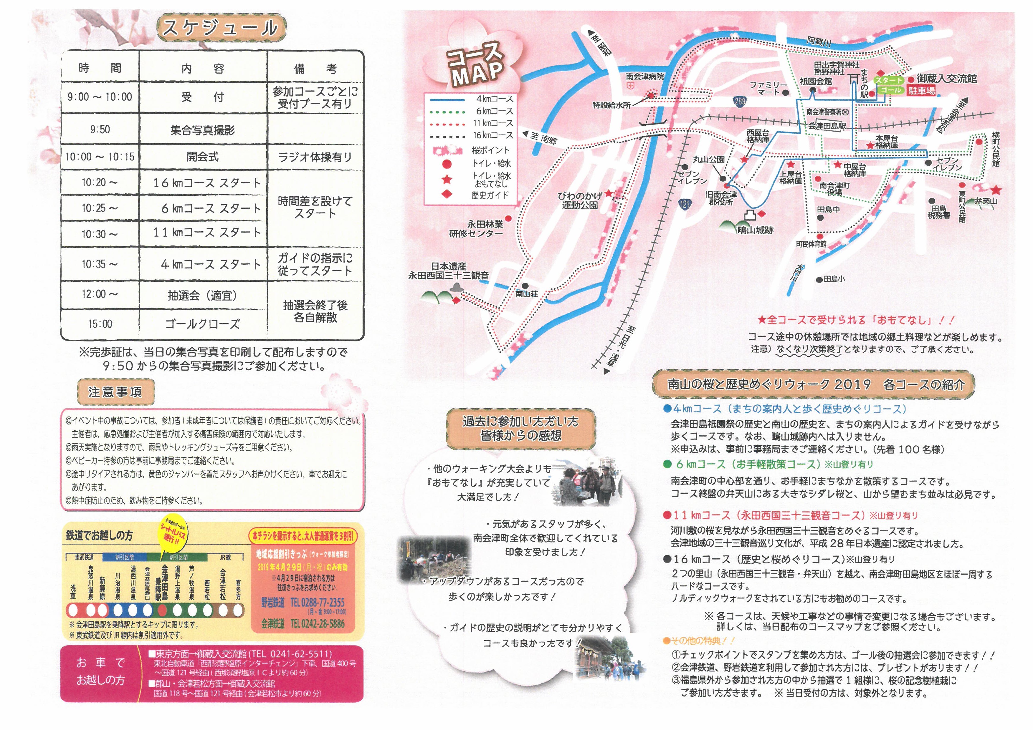 [PR] ×[PR]上記の広告は3ヶ月以上新規記事投稿のないブログに表示されています。新しい記事を書く事で広告が消えます。 第二回 大内宿茶会 令和元年6月9日(日) 午前9時30分~午後3時 福島県下郷町大内宿本陣前(大内宿町並み展示館) 茶席一席三百円(税込) 抹茶・茶菓子付 *茶券は、当日会場にてお買い求めください。 第二回 大内宿茶会が開催されます\(^o^)/ 伝統的建造物に囲まれて至福の一服を楽しんでみませんか? 茶会参加でしもごろーカード100Pプレゼント!!!!! [0回]PR 第15回 会津下野街道を行く カードを持って参加しよう\(^o^)/♪♪♪♪♪ 参加者限定でしもごろーポイント100Pプレゼント!!! [0回] 100万年ウォーク 令和元年6月2日(日)開催 100万年ウォークコースや100万年ウォーク・ハーフコースなど自分のペースに合わせて選択することができますコース途中には150名限定で「やせ馬作り」を体験することもできる他、参加特典の抽選会やオリジナルてぬぐい、さらには「しもごろーカード100P」プレゼントなどお楽しみがたくさんあります。 参加人数先着500名となっておりますので参加される場合はお早めにお申込ください。 詳しくはこちらをご覧ください(*^_^*) [0回] 南会津町桜ウォーク 4月になり、新しい年度が始まりました~(^^♪ 暖かい日が続き、桜の季節も近づいてまいりました。 ✨✨~✨✨~✨✨~✨✨~✨✨~✨✨~✨✨~✨✨~✨✨ 第8回 南山の桜と歴史めぐりウォーク2019 2019年4月29日(月・祝日) 今年も開催されます~ 南会津の桜を見ながら歩いてみるのはいかがですか~? お申し込みの締め切りが迫ってますので、 参加希望の方はお早めにお申し込みください(^▽^)/ 申込締切日:2019年4月19日(金)(必着‼) [0回] 第15回 かたくりまつり 今年もかたくりの里 桑取火で 第15回 かたくりまつりが4月27日(土)・4月28日(日)に開催されます! かたくりの群生地を今年も開放~! かたくり広場では特産品や豚汁などおもてなしもご用意しているのでお楽しみに!!! しもごろーポイントの付与もありますのでしもごろーカードを持ってかたくりをみに行こう(^^♪ 詳しくはこちらをどうぞ [0回]