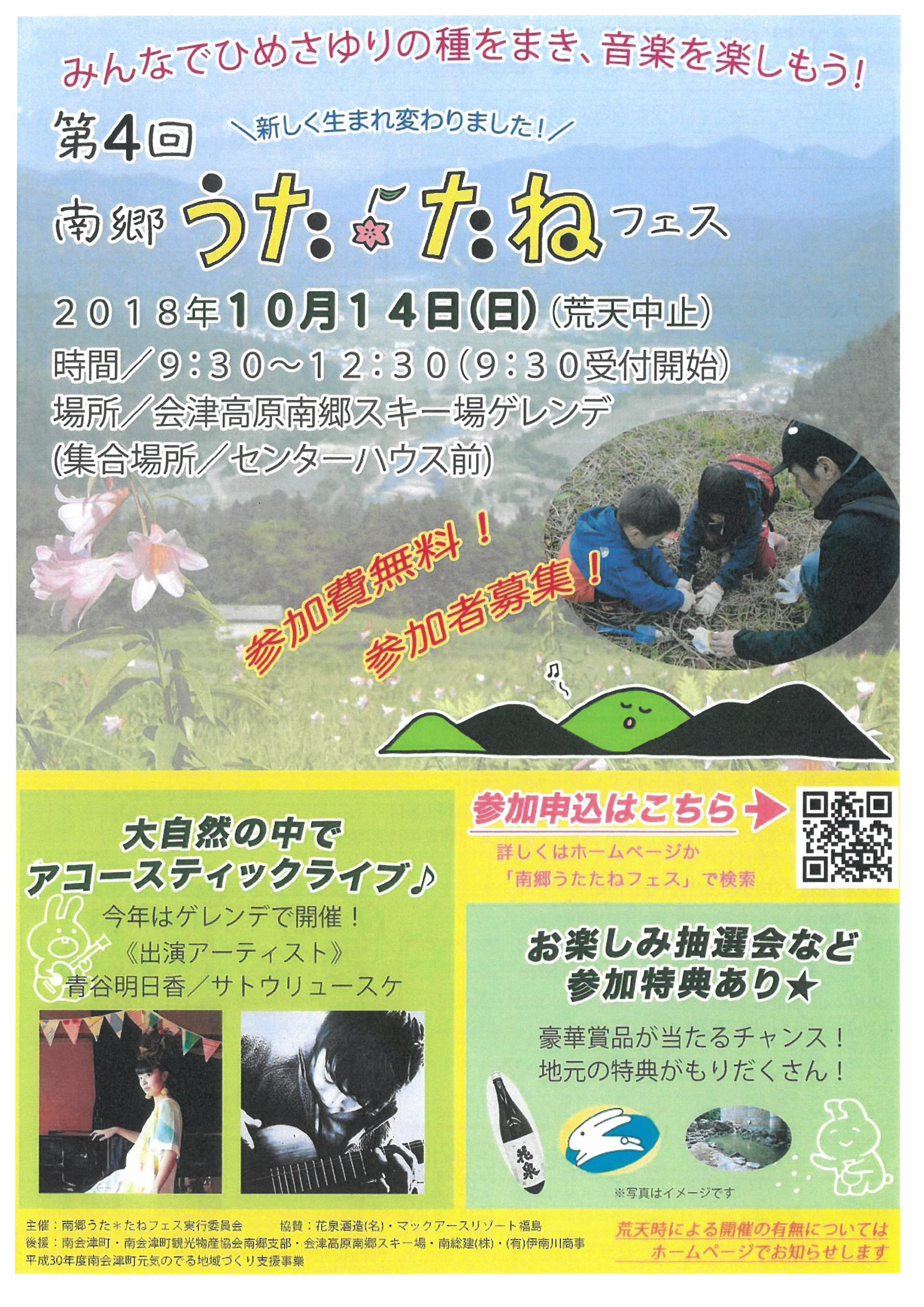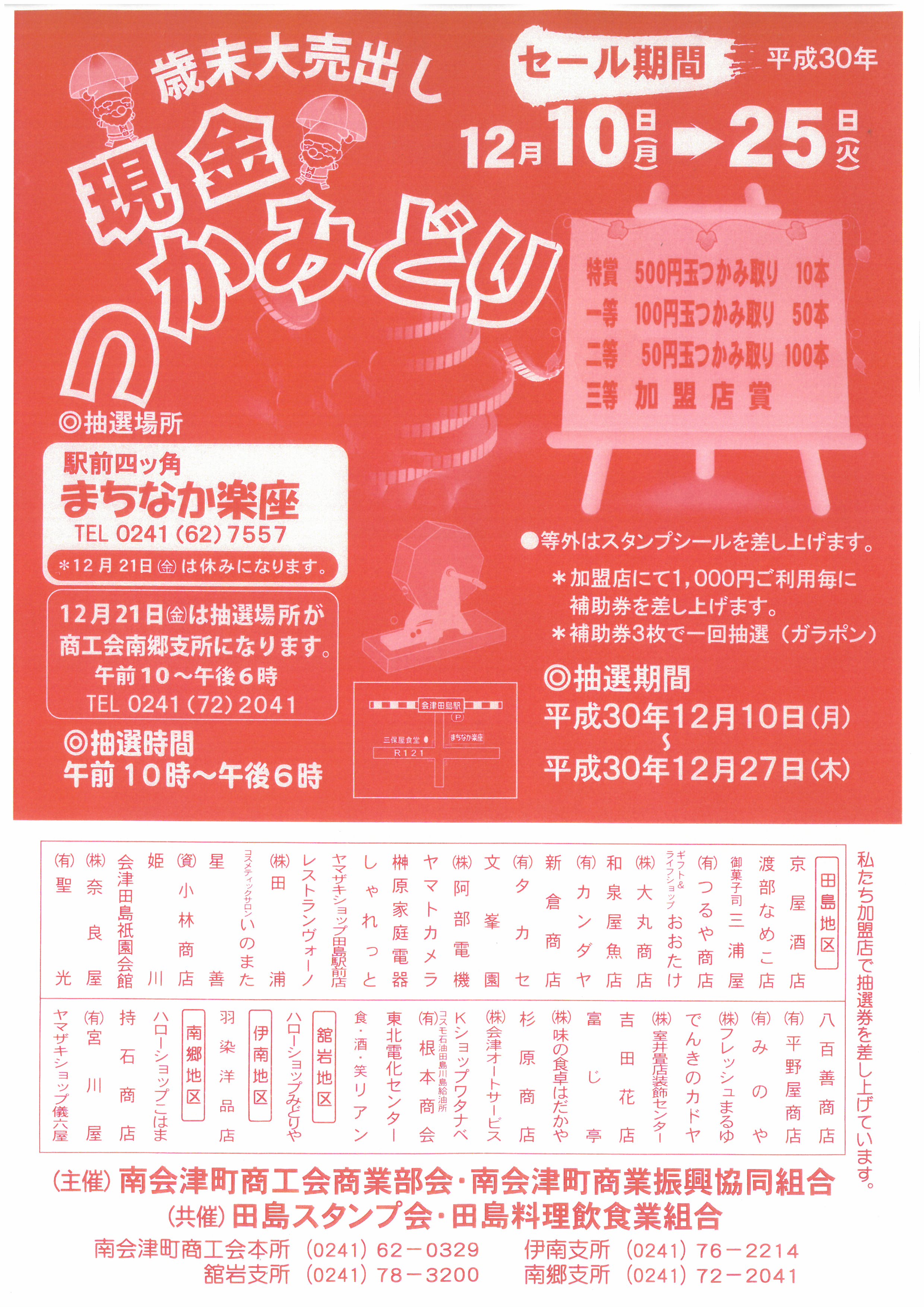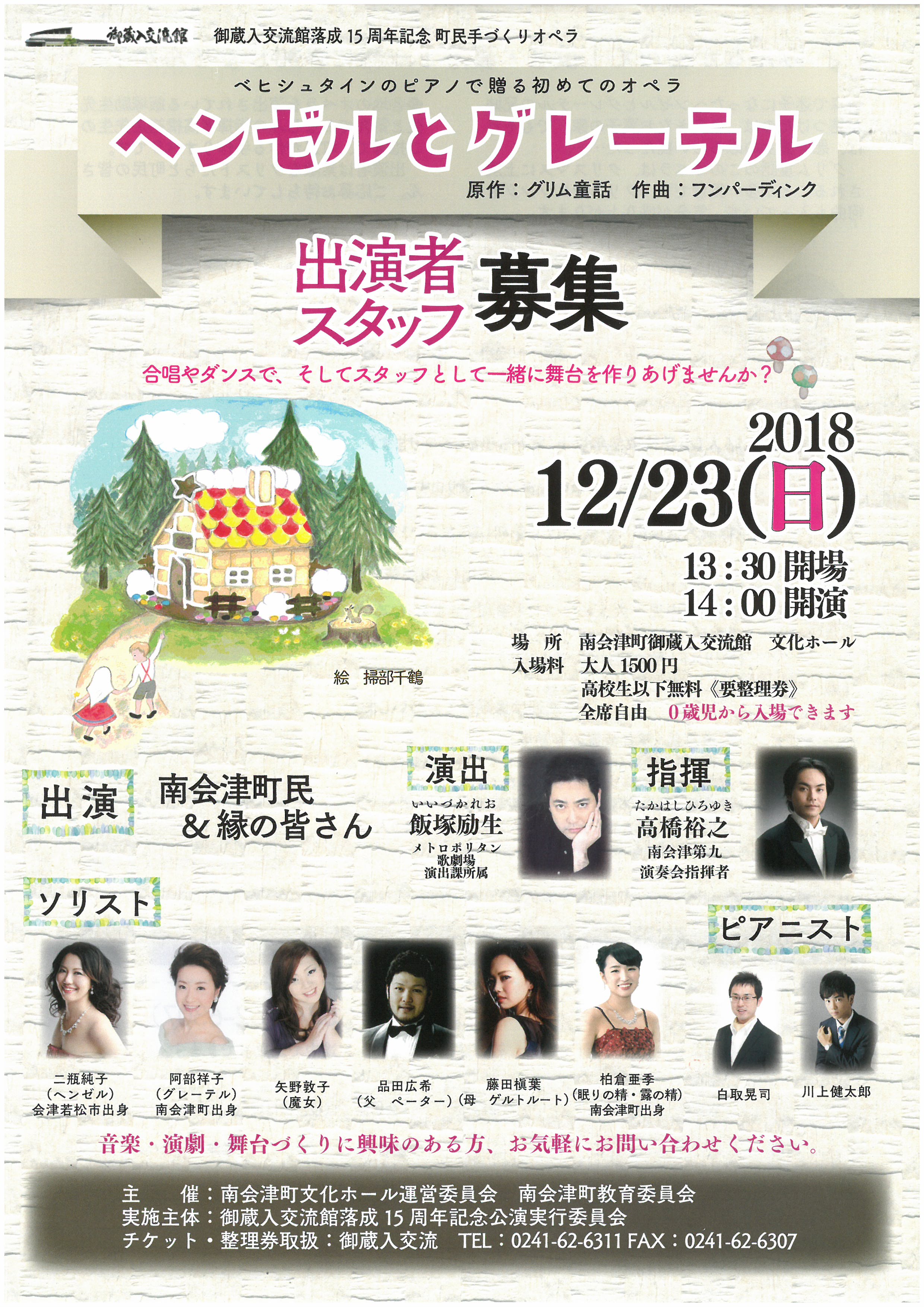 [PR] ×[PR]上記の広告は3ヶ月以上新規記事投稿のないブログに表示されています。新しい記事を書く事で広告が消えます。 現金つかみどり♪ 歳末大売り出し ✿✿✿ 現金つかみどり ✿✿✿✿✿✿ ☆補助券の配布期間 12月10日(月)~25日(火) *加盟店で1,000円お買い上げごとに補助券を差し上げます。 ★抽選期間 12月10日(月)~27日(木) *補助券3枚で一回抽選が行えます(ガラポン) ☆抽選時間 午前10時~午後6時までとなってます! ★抽選場所 駅前四つ角 まちなか楽座 *尚、12月21日は商工会南郷支所での抽選になります。 まちなか楽座での抽選はお休みになります。 この機会をお見逃しなく!!! [2回]PR 屋台歌舞伎 特別舞台公演 子どもがふみだす ふくしま復興体験応援事業 第6回 田島祇園祭 屋台歌舞伎 特別舞台公演 田島小学校3年生の児童と 田島祇園祭屋台歌舞伎保存会の方々が出演いたします ★平成30年 12月2日(日) ★開演 13時 ★場所 御蔵入交流館文化ホール 入場は無料です! ぜひ見にいらしてください♪ [0回] 『ヘンゼルとグレーテル』 こんにちは! 毎日寒くなり、山々に雪も降って、もうすぐ南会津の地にも雪が降りそうです。 タイヤ交換はお済ですか? 早めに交換して、雪に備えましょう! ☆ ★ ☆ ★ ☆ ★ ☆ ★ ☆ ★ ☆ ★ ☆ ★ ☆ ★ ☆ ★ さてさて、 心温まる、はじめての町民手づくりオペラ 『ヘンゼルとグレーテル』 見に来ませんか? 平成30年12月23日(日) 場所は南会津町御蔵入交流館 文化ホール 14:00開演です。 大人1500円、高校生以下無料です(整理券は必要です!!) [0回] 南郷 新そばまつり 第17回 『南郷 新そばまつり』のご案内です~ 2018年10月20日(土) 第1部 12:00~13:00 第2部 17:30~19:00 会場は南郷スキー場センターハウスです 各部先着120名様になりますので、 お早めに予約してください!! 詳しくはパンフレットをご覧ください [1回] 南郷 うたたねフェス♪ 第4回 南郷 うた♪たね フェスのご案内です~ 平成30年10月14日(日) (後天中止) 時間/9:30~12:30(9:30受付開始) 場所/会津高原南郷スキー場ゲレンデ (集合場所/センターハウス前) 音楽ライブは 青谷明日香さんとサトウリュウスケさんです みんなでひめさゆりの種をまき、音楽を楽しもう! [0回]