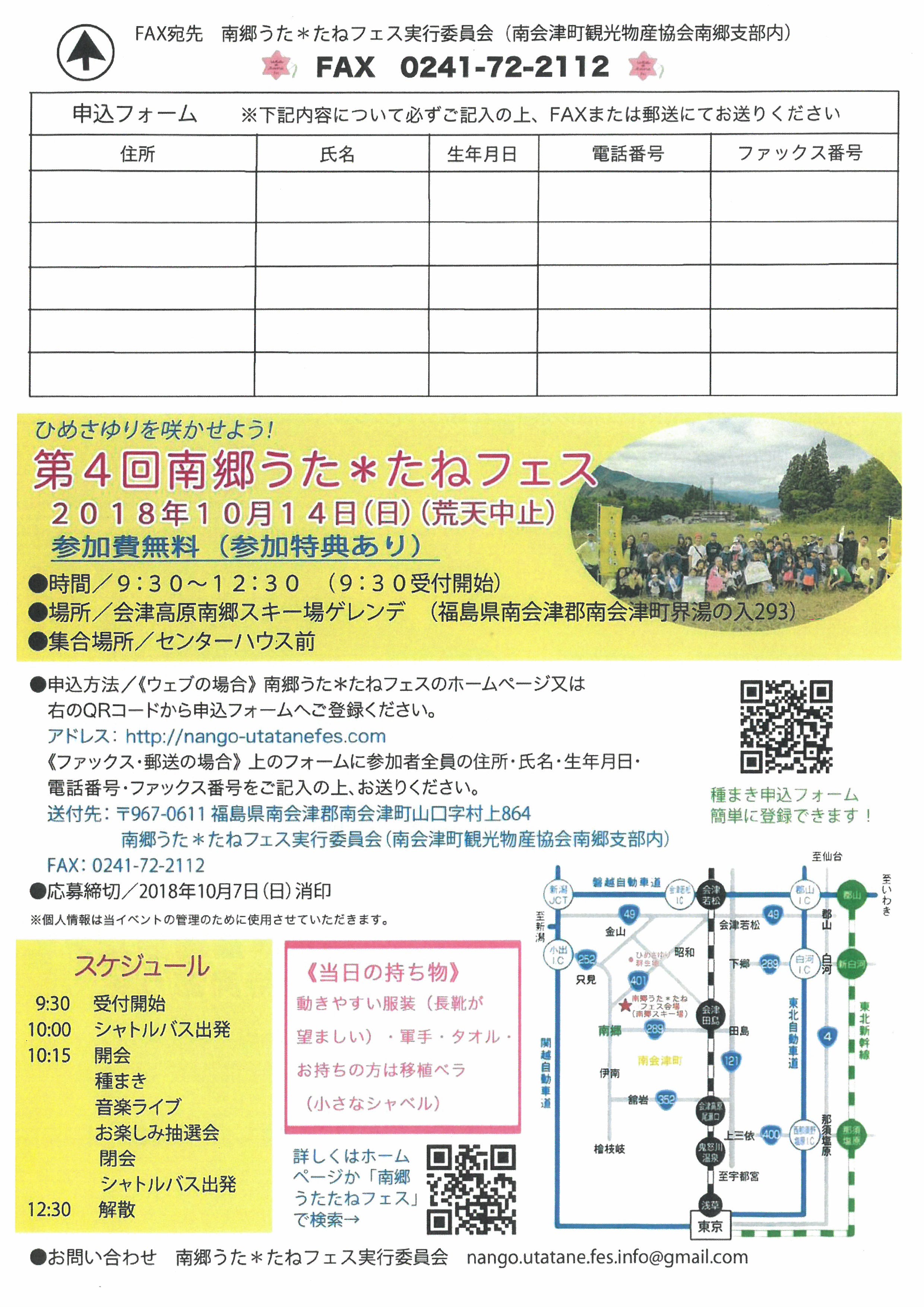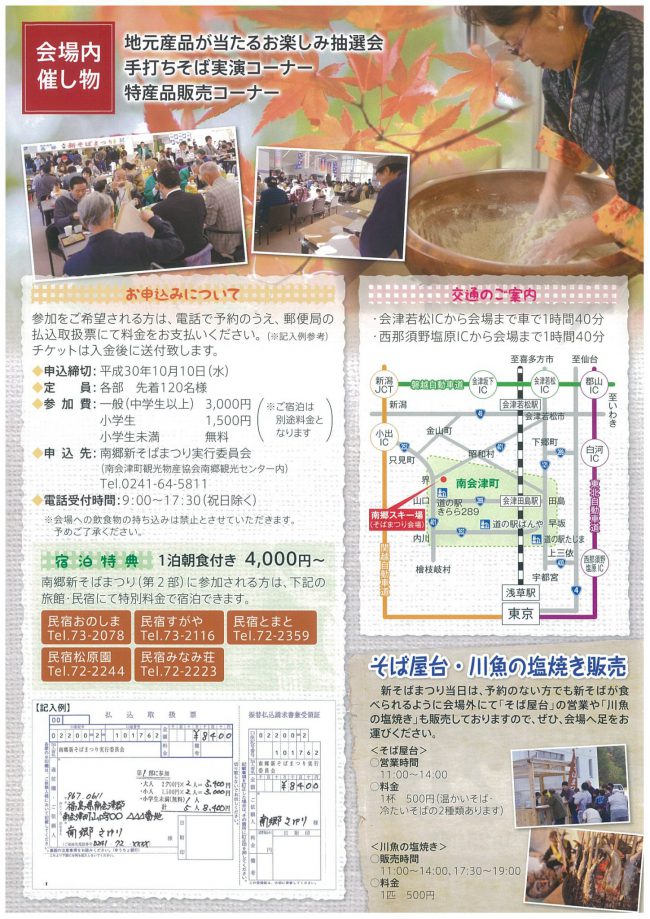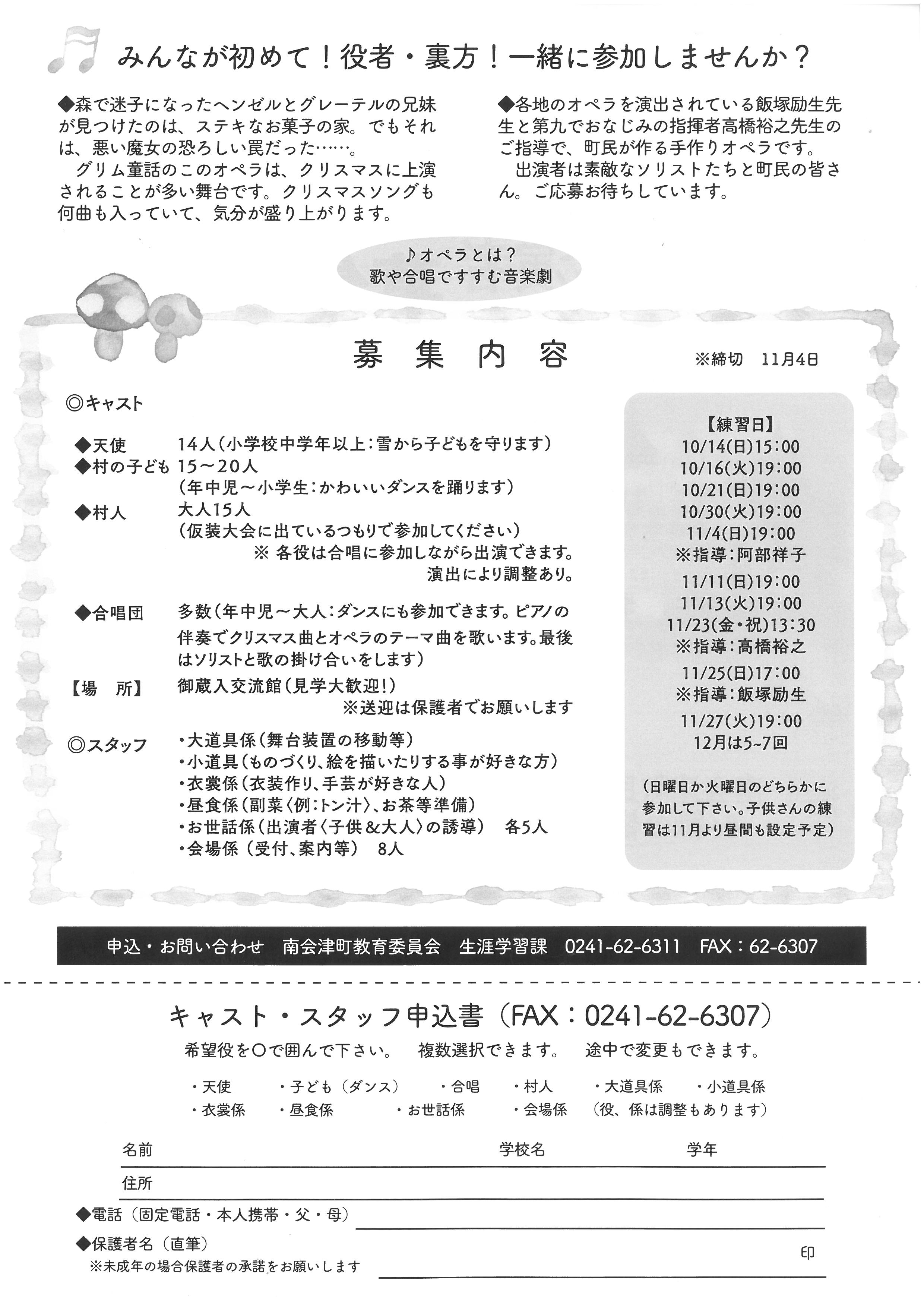 [PR] ×[PR]上記の広告は3ヶ月以上新規記事投稿のないブログに表示されています。新しい記事を書く事で広告が消えます。 現金つかみどり♪ 歳末大売り出し ✿✿✿ 現金つかみどり ✿✿✿✿✿✿ ☆補助券の配布期間 12月10日(月)~25日(火) *加盟店で1,000円お買い上げごとに補助券を差し上げます。 ★抽選期間 12月10日(月)~27日(木) *補助券3枚で一回抽選が行えます(ガラポン) ☆抽選時間 午前10時~午後6時までとなってます! ★抽選場所 駅前四つ角 まちなか楽座 *尚、12月21日は商工会南郷支所での抽選になります。 まちなか楽座での抽選はお休みになります。 この機会をお見逃しなく!!! [2回]PR 屋台歌舞伎 特別舞台公演 子どもがふみだす ふくしま復興体験応援事業 第6回 田島祇園祭 屋台歌舞伎 特別舞台公演 田島小学校3年生の児童と 田島祇園祭屋台歌舞伎保存会の方々が出演いたします ★平成30年 12月2日(日) ★開演 13時 ★場所 御蔵入交流館文化ホール 入場は無料です! ぜひ見にいらしてください♪ [0回] 『ヘンゼルとグレーテル』 こんにちは! 毎日寒くなり、山々に雪も降って、もうすぐ南会津の地にも雪が降りそうです。 タイヤ交換はお済ですか? 早めに交換して、雪に備えましょう! ☆ ★ ☆ ★ ☆ ★ ☆ ★ ☆ ★ ☆ ★ ☆ ★ ☆ ★ ☆ ★ さてさて、 心温まる、はじめての町民手づくりオペラ 『ヘンゼルとグレーテル』 見に来ませんか? 平成30年12月23日(日) 場所は南会津町御蔵入交流館 文化ホール 14:00開演です。 大人1500円、高校生以下無料です(整理券は必要です!!) [0回] 南郷 新そばまつり 第17回 『南郷 新そばまつり』のご案内です~ 2018年10月20日(土) 第1部 12:00~13:00 第2部 17:30~19:00 会場は南郷スキー場センターハウスです 各部先着120名様になりますので、 お早めに予約してください!! 詳しくはパンフレットをご覧ください [1回] 南郷 うたたねフェス♪ 第4回 南郷 うた♪たね フェスのご案内です~ 平成30年10月14日(日) (後天中止) 時間/9:30~12:30(9:30受付開始) 場所/会津高原南郷スキー場ゲレンデ (集合場所/センターハウス前) 音楽ライブは 青谷明日香さんとサトウリュウスケさんです みんなでひめさゆりの種をまき、音楽を楽しもう! [0回]