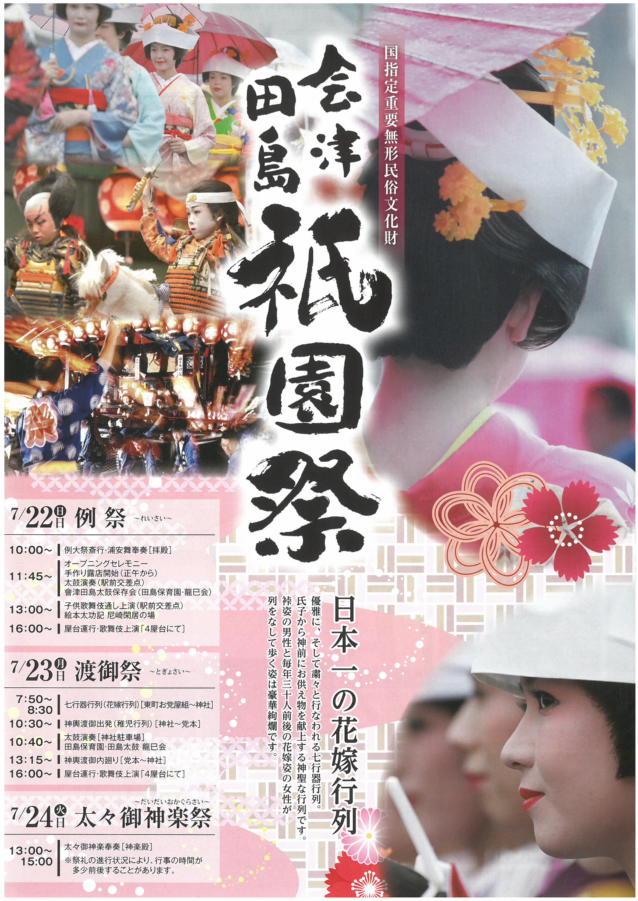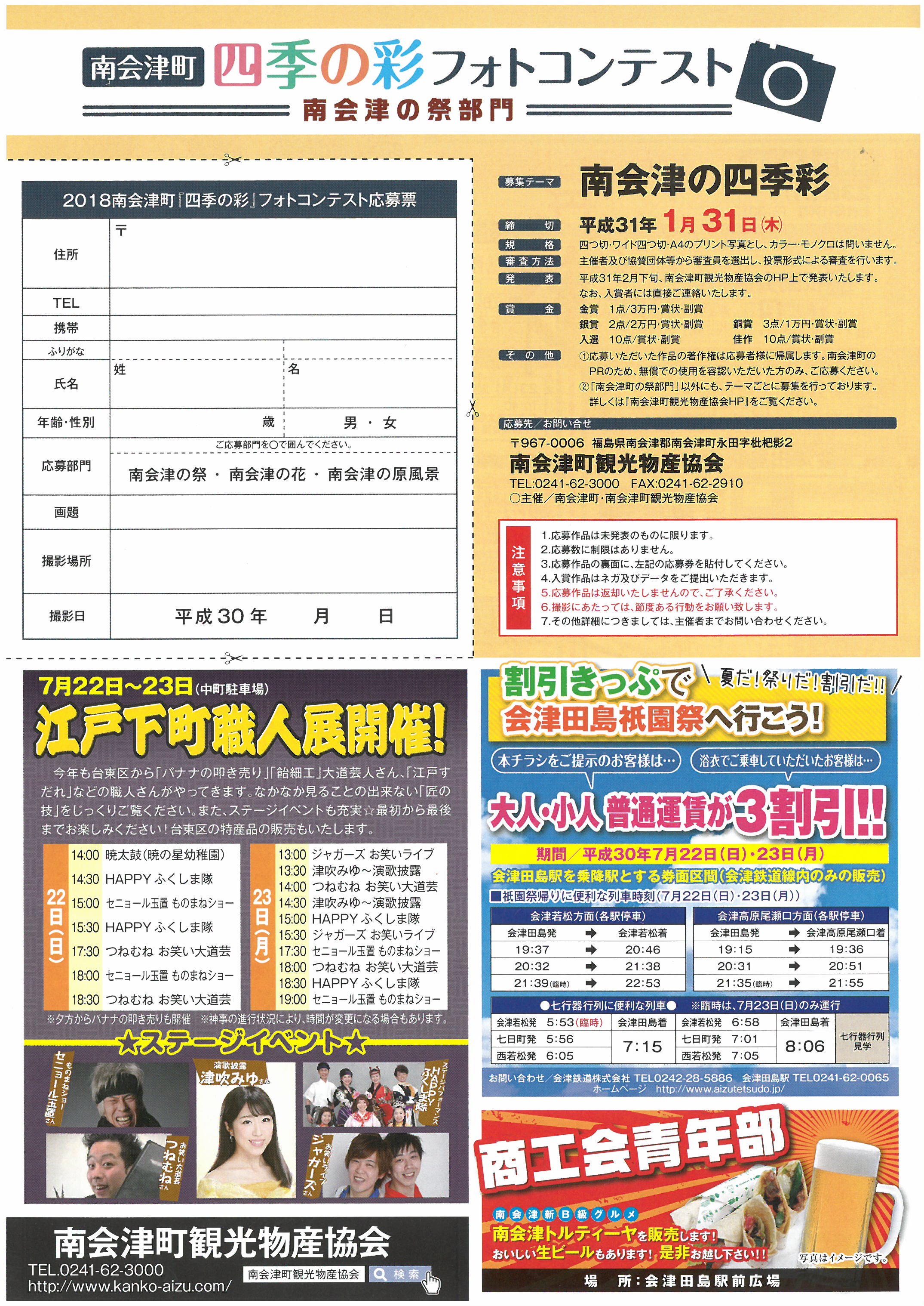 [PR] ×[PR]上記の広告は3ヶ月以上新規記事投稿のないブログに表示されています。新しい記事を書く事で広告が消えます。 第13回下郷ふるさと祭り開催のお知らせ あつ~い夏がきましたね(^^♪ と言うことは......... 恒例の下郷ふるさと祭りが開催されます!! 当日は駐車場の混雑が予想されますので鉄道やシャトルバスなどをご利用くださいますようお願い いたしますm(__)m なお熱中症対策をしっかりし、思いっきり楽しんでくださいね!! [0回]PR プレミアム商品券販売のお知らせ!! 暑い日が続いておりますが、いかがお過ごしでしょうか? 熱中症対策をしっかりし、体調管理につとめて下さいね(^^) さて、今年もプレミアム商品券が販売されますよーーーーー!!! 東北初!! 下郷町の商品券が変わりました\(^o^)/ 紙の商品券 ⇒ ICカードへ 日 時 平成30年7月22日(日) 午前9時~午後4時 場 所 下郷町ふれあいセンター内 なくなり次第終了となりますのでお早めにお越しくださいm(__)m 詳しくはこちら ↓ ↓ ↓ ↓ ↓ [0回] たていわ花火大会やります たていわ夏まつり☆花火大会のご案内です! 7月28日(土) 会津高原たかつえスキー場にて開催いたします! 今年はぱちっこりんのお笑いライブありますよ~ 花火大会は20時からです 詳しくはパンフレットをご覧ください 当日は駐車場など周辺が混み合いますので気をつけてお越しください!! [0回] 会津田島祇園祭☆彡 毎日、暑い日が続き、夜も寝苦しいですね~ みなさん、熱中症対策はされてますか? 運動や農作業など長時間外にいるような時は対策はしっかりと準備万端で行ってくださいね! ~★~☆~★~☆~★~☆~★~☆~★~☆~★~☆~★~☆~★~ さて、 2018年の田島祇園祭のご案内いたします 7/22(日)~7/24(火)まで 11:45~オープニングセレモニー始まります! 二日目に行われる花嫁行列(七行器行列)、今年は東町からの出発になります。 当日は通行止めになりますので、お気をつけてお越しください [0回] 七夕祭り\(^ω^)/ もうすぐ7月ですね~ 7月と言えば七夕ですね なにかお願い事はしましたか?? 南会津町では七夕祭りが開催されます!! 今年もラムネの早飲み大会やりますよ~ 小学生以下のお子様にはスーパーボールすくいや金魚すくいもありますので、 チラシについている一回券を持って来てくださいね さらに!! 浴衣特典で ☆ドリンクチケットプレゼント(早い者勝ち!!) ☆じゃんけん大会参加できます(勝者には商品券などプレゼント) たくさんのご来場お待ちしております [1回]