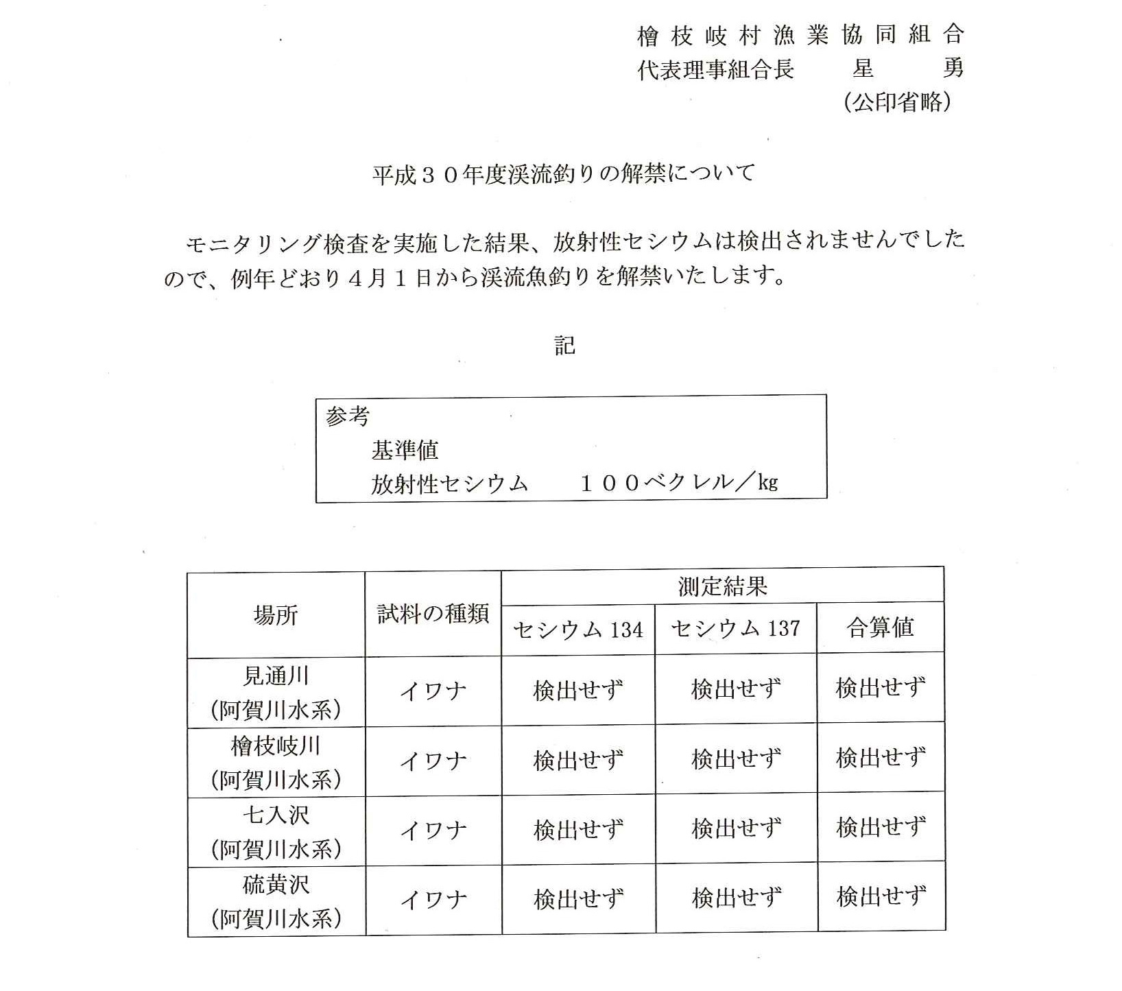 モニタリング検査の結果、放射性セシウムは検出されませんでしたので、例年どおり4月1日から渓流釣りを解禁いたします(^^)