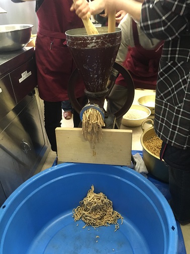 昔は手で回しながら大豆をつぶしていました。これが結構重労働