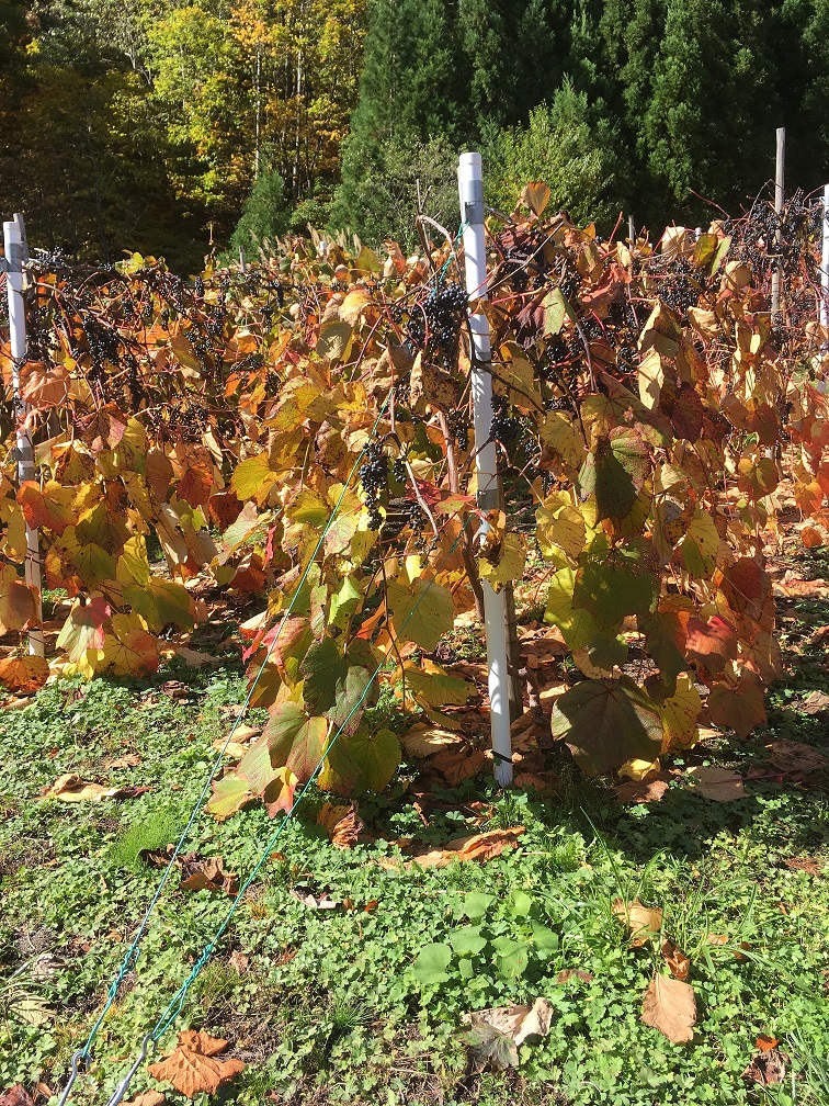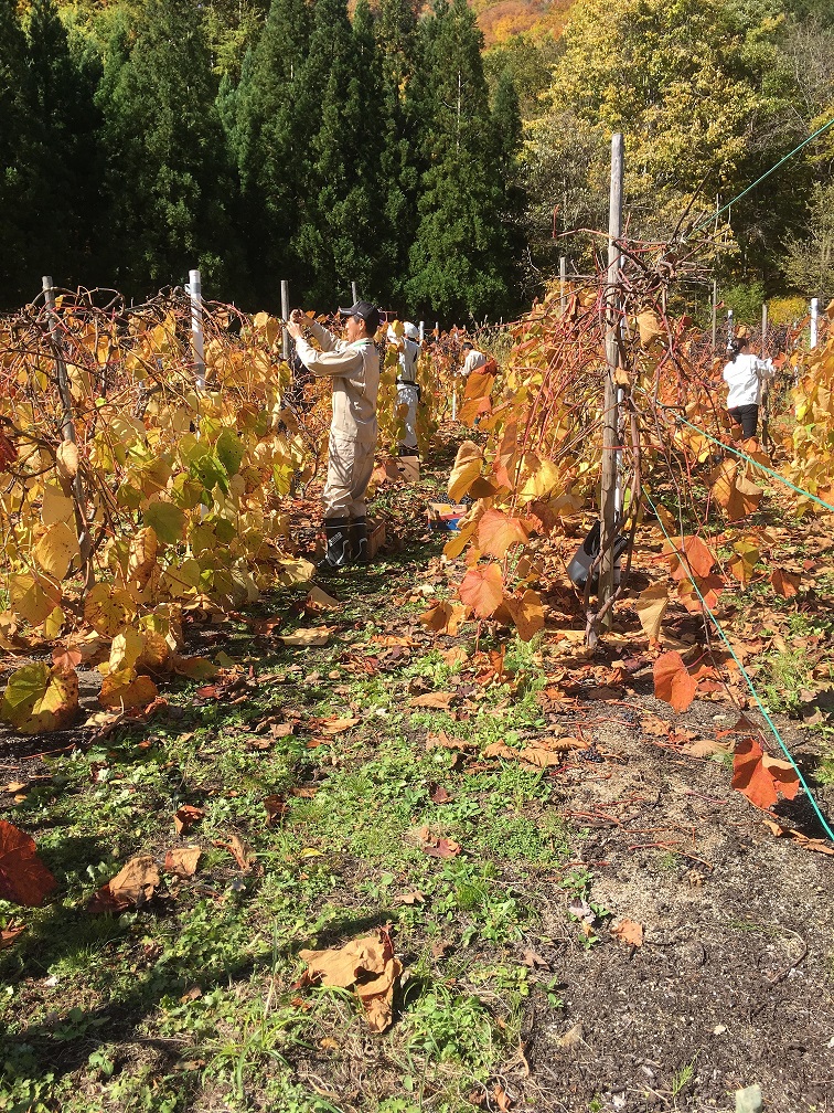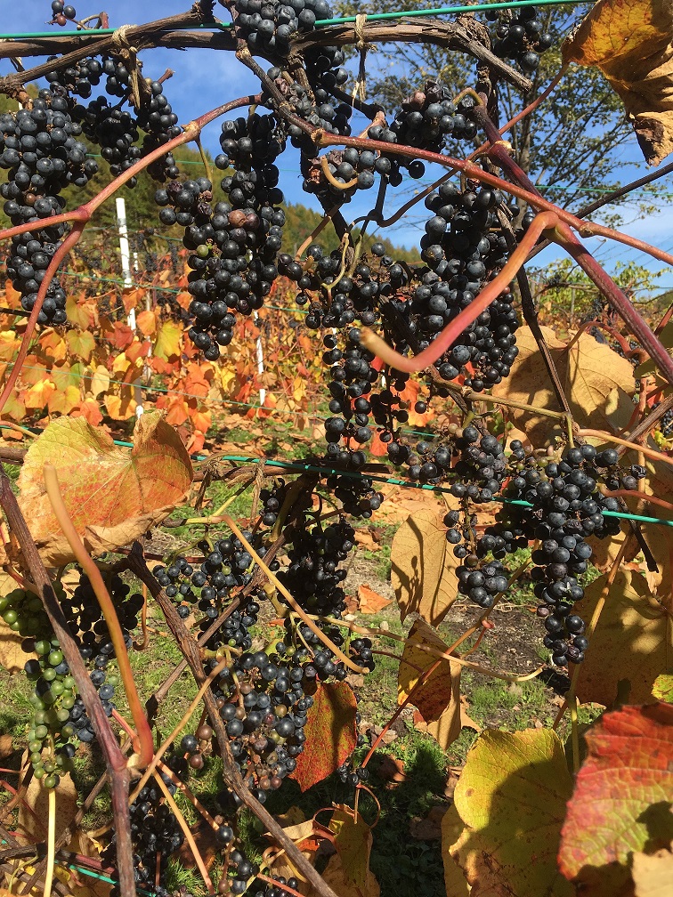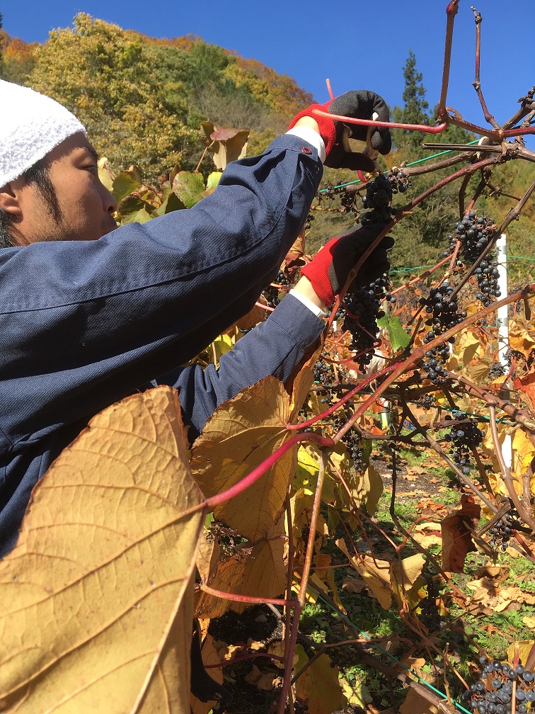 山ぶどうは、葉が落ちてしまうと冬モードになり、実がしぼんで腐ってしまうとのことで、収穫時期も大事なんだよと教えてくださりました。今年は雨が多く大変だったそうです。皆さんの苦労が実を結び、粒はパンパンで大変綺麗な色です