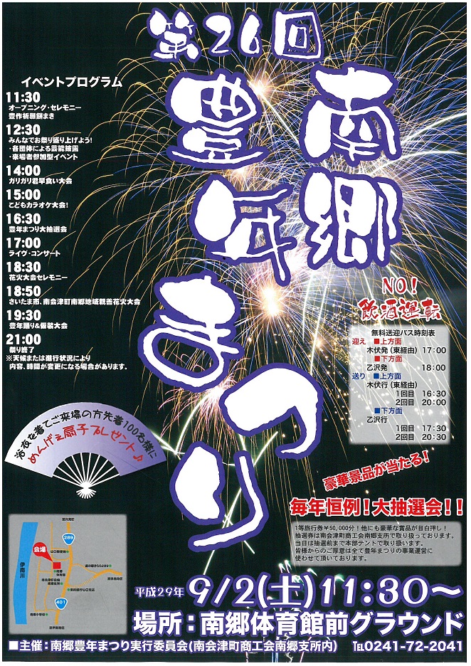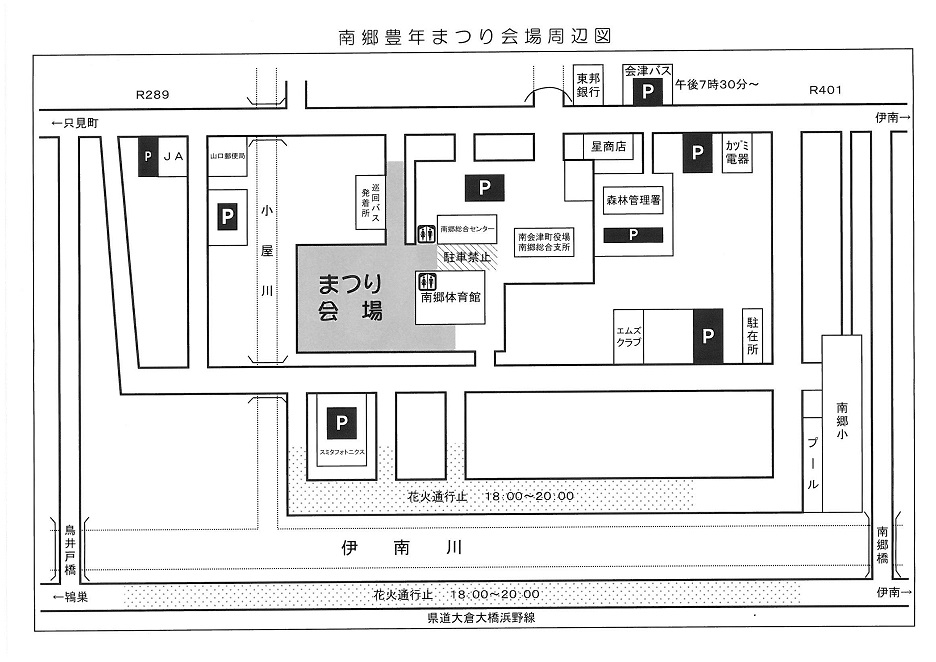 お車でお越しのお客様へ歌舞伎が上演される『檜枝岐の舞台』前の国道は見通しが悪く、道路に停車し下車されると大変危険です。村内の役場前駐車場(または中土合公園駐車場)で下車し、歩いて舞台までお越しくださいますようお願いいたします。