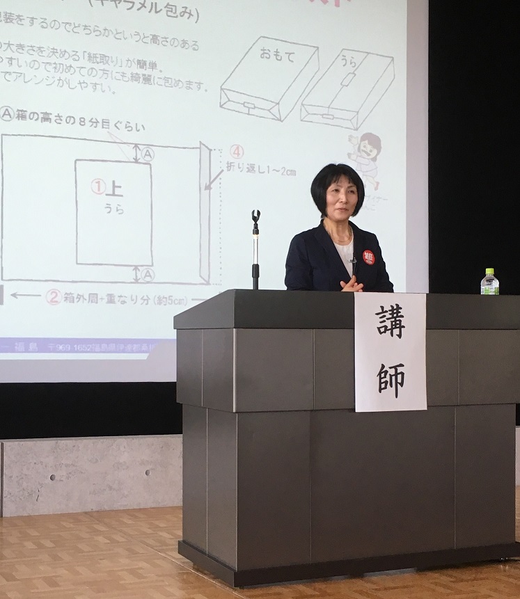 研修会の午後の部では、POPセンター福島代表の川村洋一先生とPOPセンター福島チーフデザイナー佐藤淳子先生を講師にお迎えし、POP広告とラッピングの基礎を学びました。