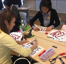 講習は、川村先生のPOP広告の効果などの説明を受け、課題を示され自分のスタイルで作成し、その後、文字の形や書き方等を教えていただき、同じものを作成したところ、その上達は凄かったです。また、佐藤先生には基本の箱包みと簡単にできるリボンアレンジを学びました。
