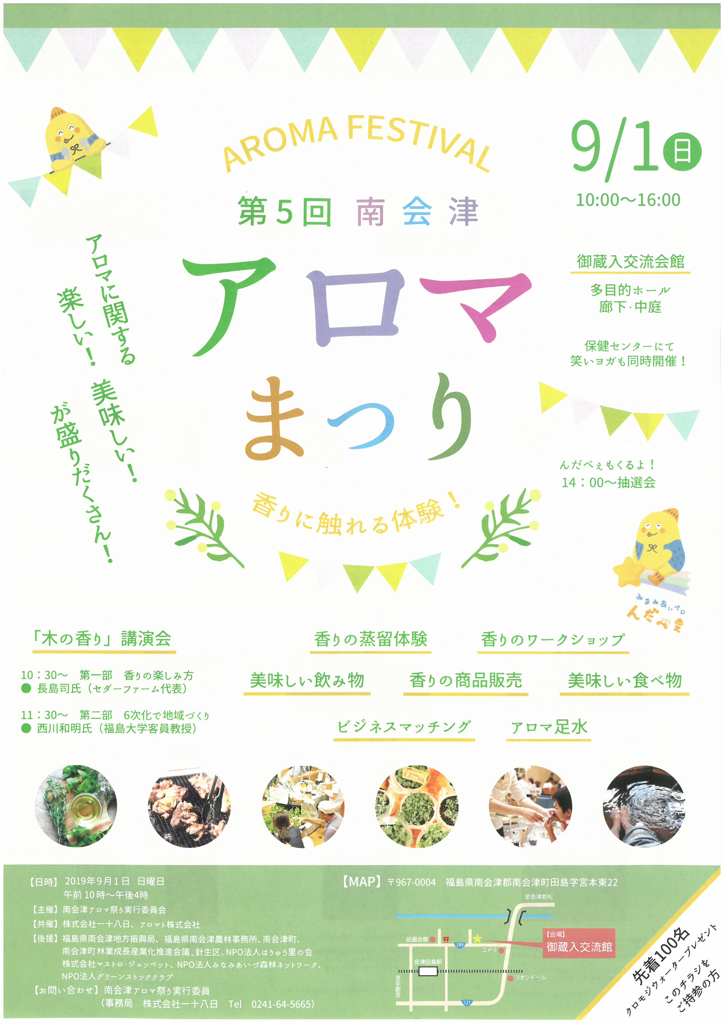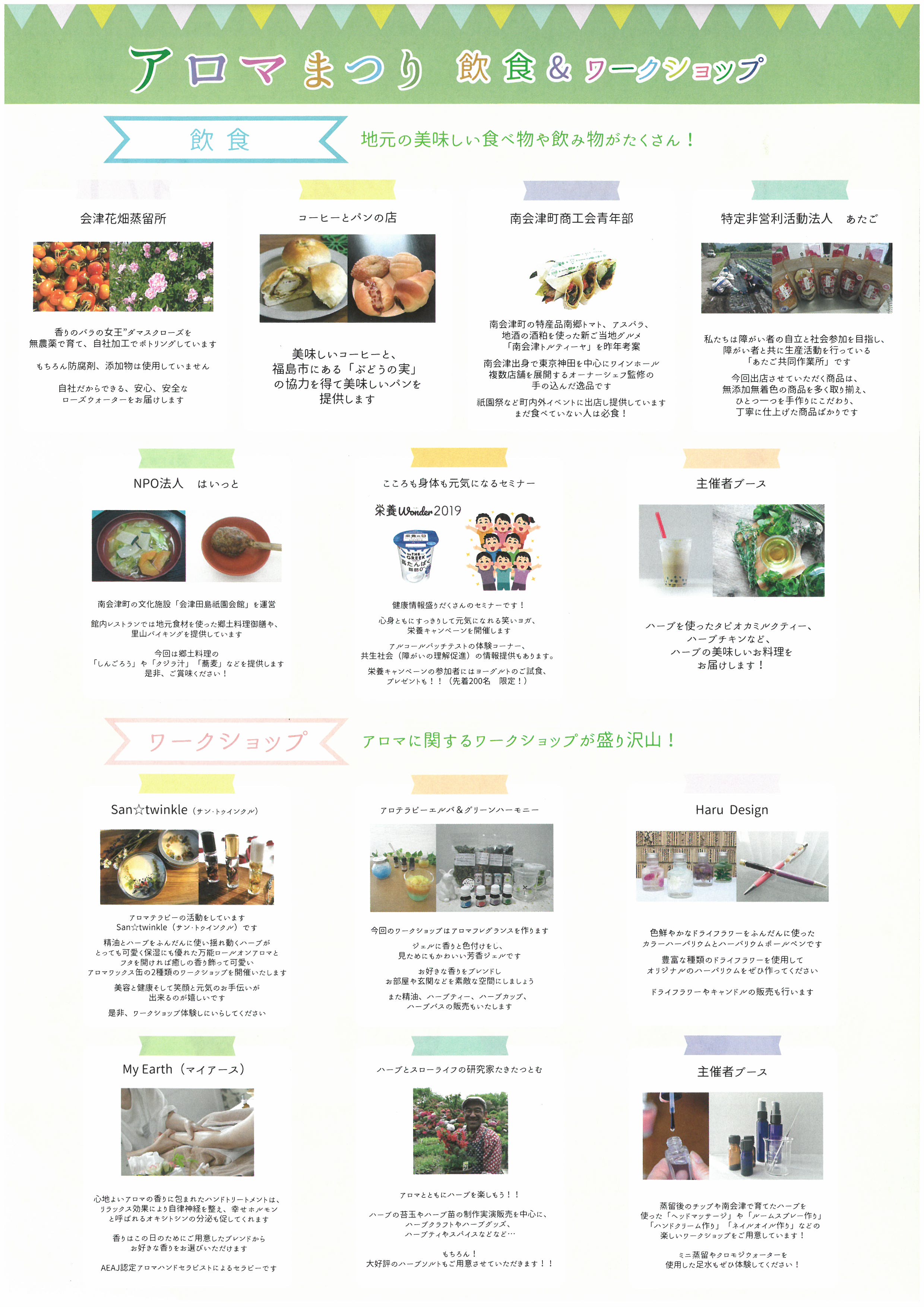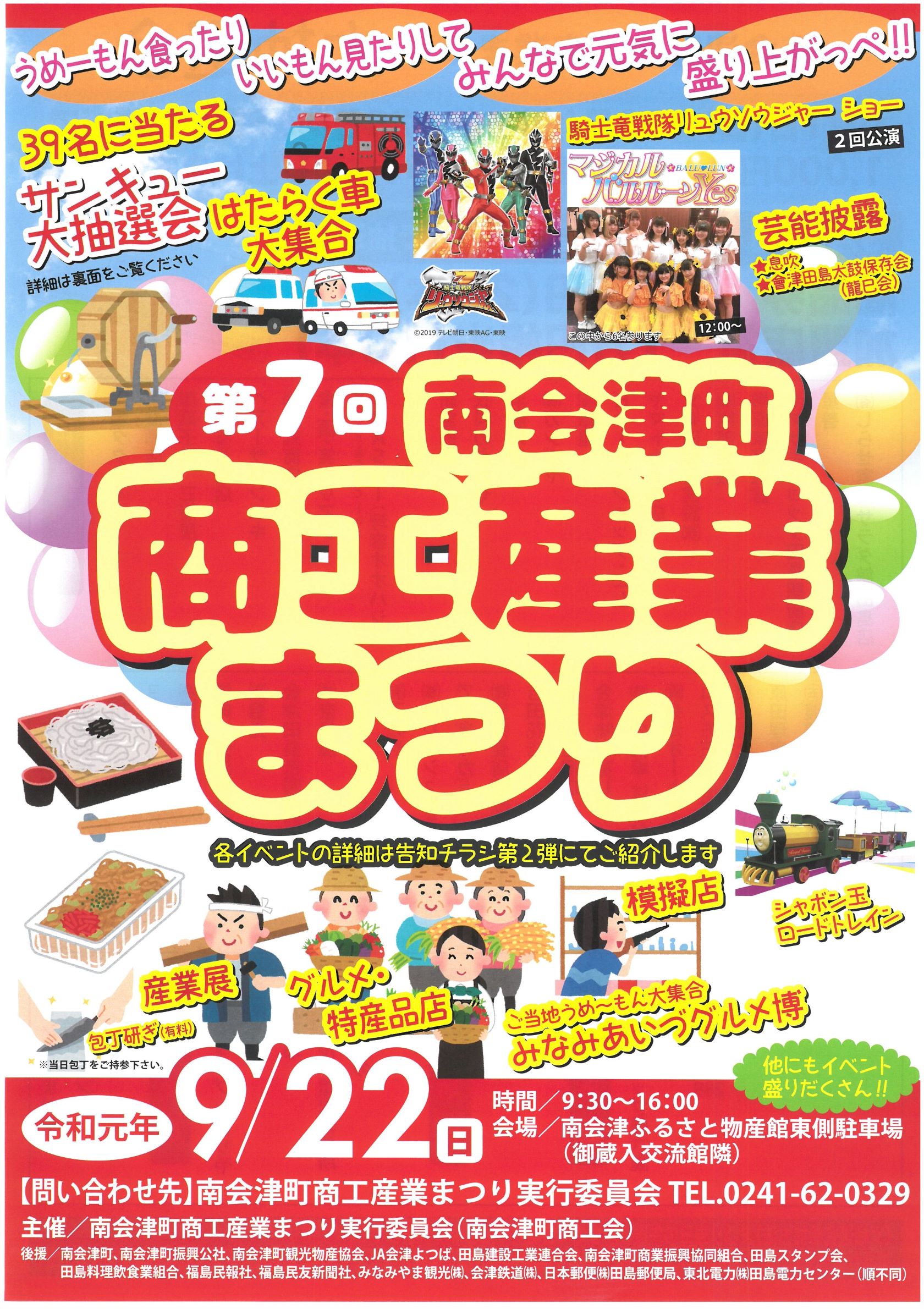 [PR] ×[PR]上記の広告は3ヶ月以上新規記事投稿のないブログに表示されています。新しい記事を書く事で広告が消えます。 南会津町商工産業まつり 第7回 南会津町 商工産業まつり 9/22(日) ●9:15~ 息吹によるオープニングイベント ●9:30~ 開会セレモニーを行います! チラシには9:30~開始となっておりますが9:15~息吹による演舞がありますので ぜひお早めに足を運んでください * * * 南会津のグルメや特産品などの模擬店 産業展 はたらく車展示 シャボン玉ロードトレイン リュウソージャーとマジカルバルルーンYesのショーもあるよ * * * 当日、天気が思わしくないような予報ですが、、、 晴れますように [0回]PR 古町のまつり 9/14(土) 廣瀬神社例大祭 ● 7:00~御神輿渡御 ●11:30~御中廻り ●17:00~還御行列 9/14(土)、15(日)と露店も出てます~! 古式ゆかしく行われる古町のまつり、 一度見に来てください [0回] 南郷豊年まつりのご案内 第28回 ★★★南郷豊年まつりが開催されます★★★ 今年は南高祭と合同開催です! 令和元年9月7日(土) 11:30より オープニングセレモニー&豊作祈願餅まき 子供カラオケ大会やライブ・コンサート ガリガリ君早食い大会 豊年踊り・仮装大会 花火大会は18:50からです 開場は県立南会津高校のグラウンドになります~ 出店もたくさんありますので、ぜひお越しください [1回] 『アロマまつり』のご案内 第5回 南会津 アロマまつり 9/1(日) 10:30~16:00 御蔵入交流会館にて 多目的ホール 廊下・中庭 地元の美味しい食べ物や飲み物! アロマに関するワークショップが盛り沢山! 今人気のハーバリウム作成や、ハンドトリートメント、ルームスプレー作りなどなど 香りに触れる楽しい体験ができますよー 興味のある方はぜひ足を運んでみてください [2回] 南会津そばウォーク 2019年 9/1(日) 南会津そばウォークが開催されます!! 標高1,000mの爽やかな高原をウォーキングしませんか? 申込締切・・・当日まで受け付けますが、記念品は先着400名限りとなります ゴール後は雪室そばやお楽しみ抽選会もあります~ 雪室そばは事前に申し込みが必要になりますので、食べたい方はぜひ!! [0回]