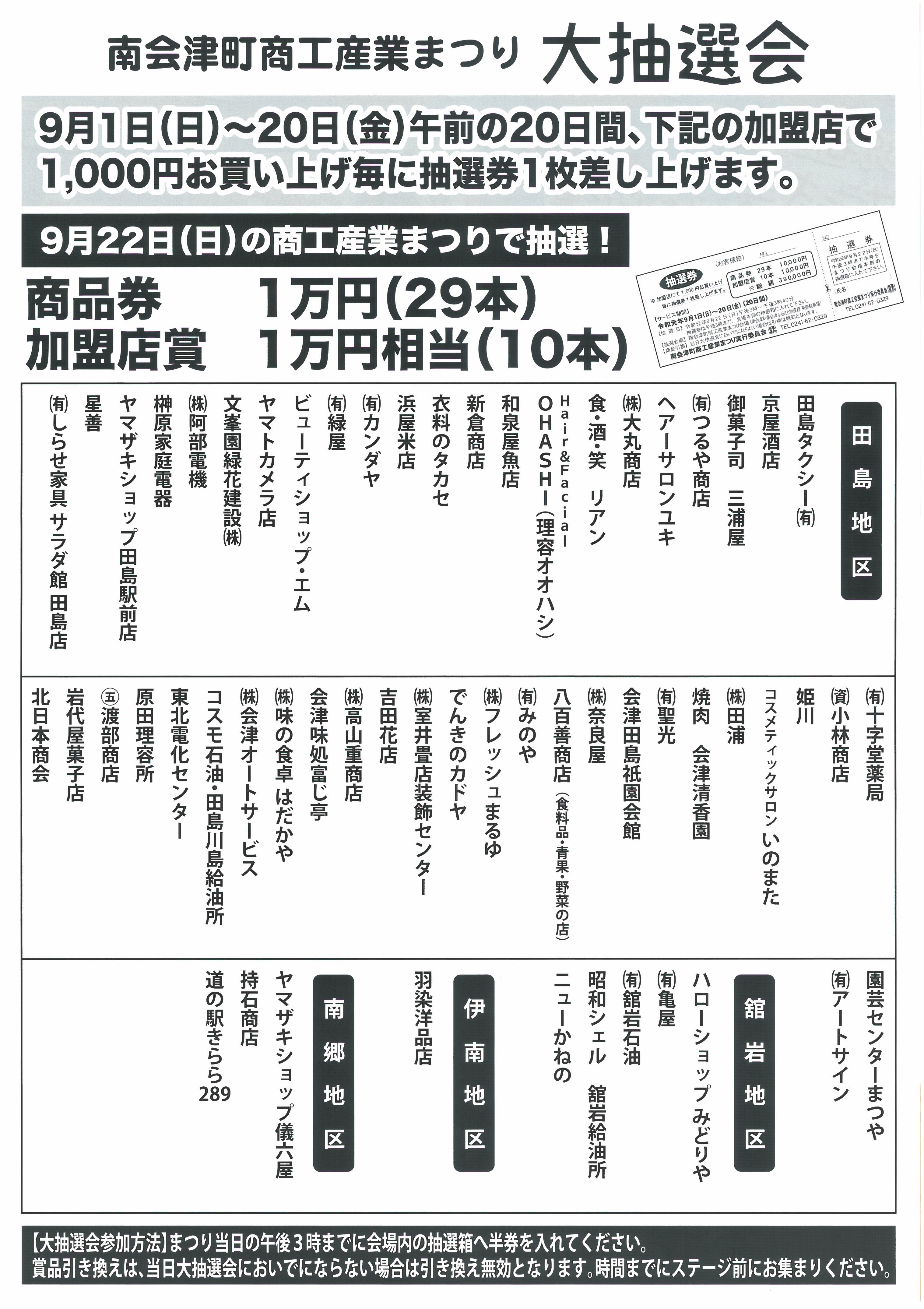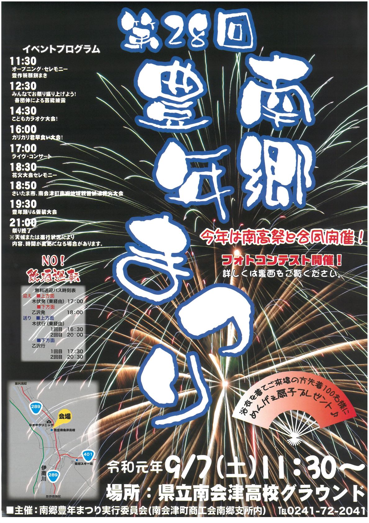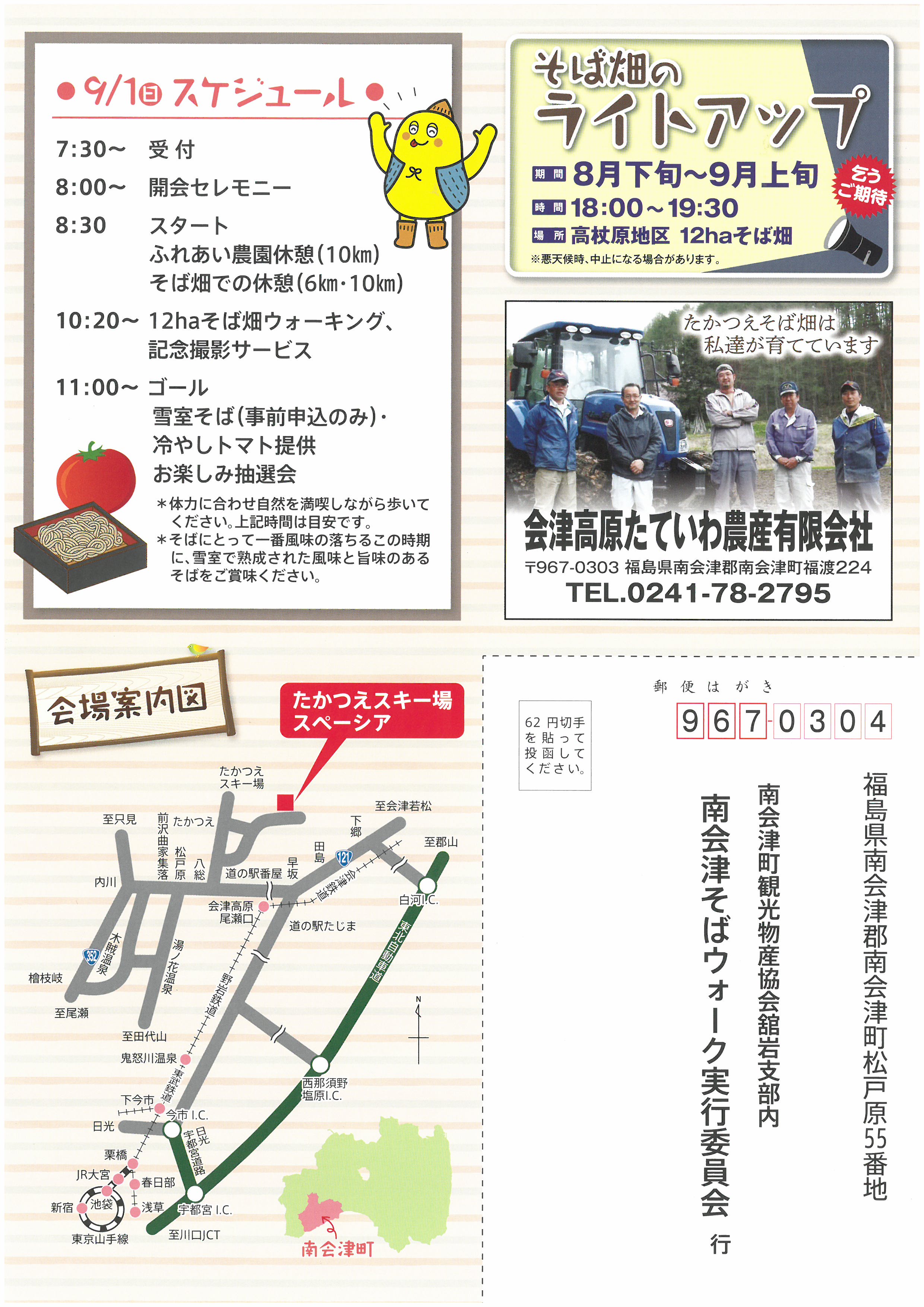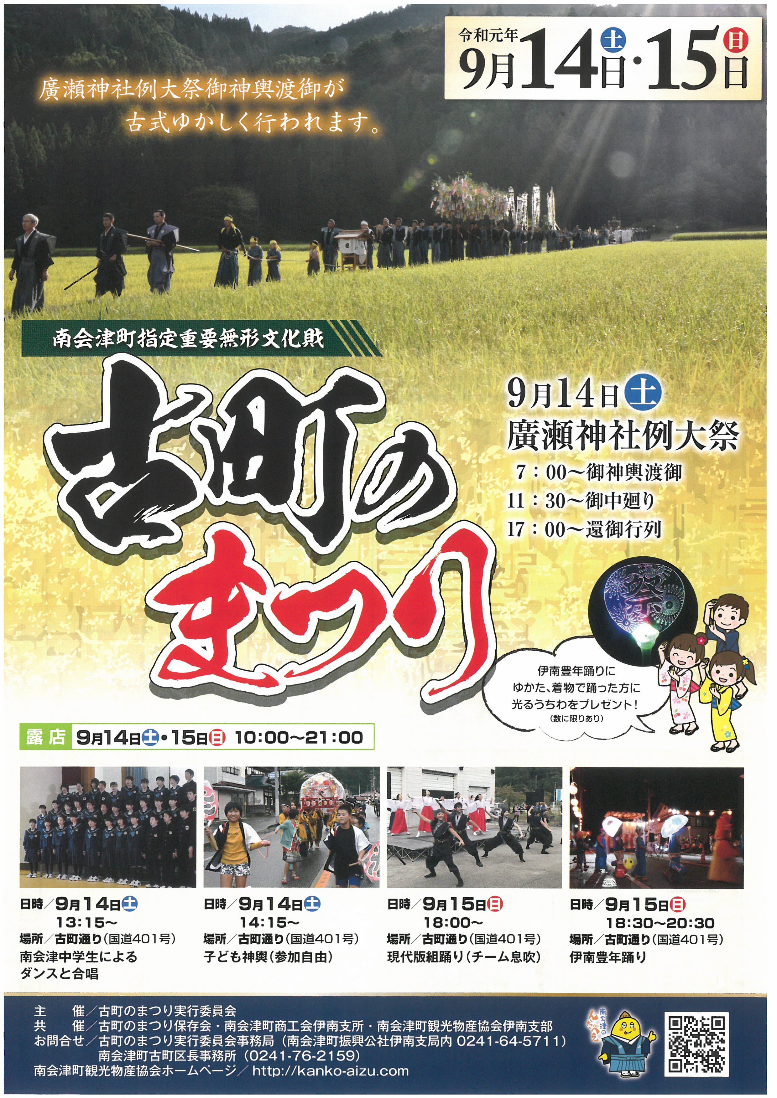 [PR] ×[PR]上記の広告は3ヶ月以上新規記事投稿のないブログに表示されています。新しい記事を書く事で広告が消えます。 南会津町商工産業まつり 第7回 南会津町 商工産業まつり 9/22(日) ●9:15~ 息吹によるオープニングイベント ●9:30~ 開会セレモニーを行います! チラシには9:30~開始となっておりますが9:15~息吹による演舞がありますので ぜひお早めに足を運んでください * * * 南会津のグルメや特産品などの模擬店 産業展 はたらく車展示 シャボン玉ロードトレイン リュウソージャーとマジカルバルルーンYesのショーもあるよ * * * 当日、天気が思わしくないような予報ですが、、、 晴れますように [0回]PR 古町のまつり 9/14(土) 廣瀬神社例大祭 ● 7:00~御神輿渡御 ●11:30~御中廻り ●17:00~還御行列 9/14(土)、15(日)と露店も出てます~! 古式ゆかしく行われる古町のまつり、 一度見に来てください [0回] 南郷豊年まつりのご案内 第28回 ★★★南郷豊年まつりが開催されます★★★ 今年は南高祭と合同開催です! 令和元年9月7日(土) 11:30より オープニングセレモニー&豊作祈願餅まき 子供カラオケ大会やライブ・コンサート ガリガリ君早食い大会 豊年踊り・仮装大会 花火大会は18:50からです 開場は県立南会津高校のグラウンドになります~ 出店もたくさんありますので、ぜひお越しください [1回] 『アロマまつり』のご案内 第5回 南会津 アロマまつり 9/1(日) 10:30~16:00 御蔵入交流会館にて 多目的ホール 廊下・中庭 地元の美味しい食べ物や飲み物! アロマに関するワークショップが盛り沢山! 今人気のハーバリウム作成や、ハンドトリートメント、ルームスプレー作りなどなど 香りに触れる楽しい体験ができますよー 興味のある方はぜひ足を運んでみてください [2回] 南会津そばウォーク 2019年 9/1(日) 南会津そばウォークが開催されます!! 標高1,000mの爽やかな高原をウォーキングしませんか? 申込締切・・・当日まで受け付けますが、記念品は先着400名限りとなります ゴール後は雪室そばやお楽しみ抽選会もあります~ 雪室そばは事前に申し込みが必要になりますので、食べたい方はぜひ!! [0回]