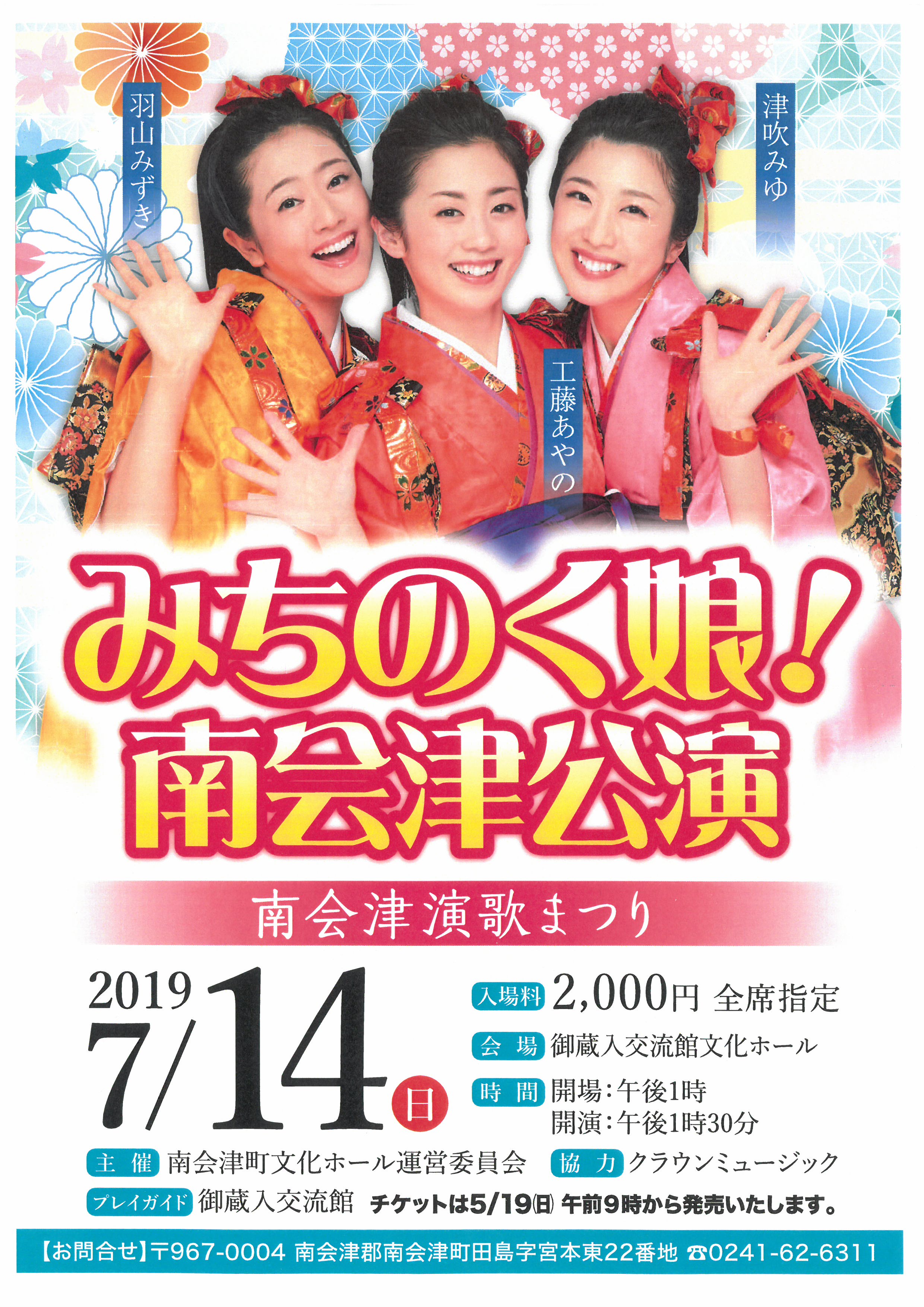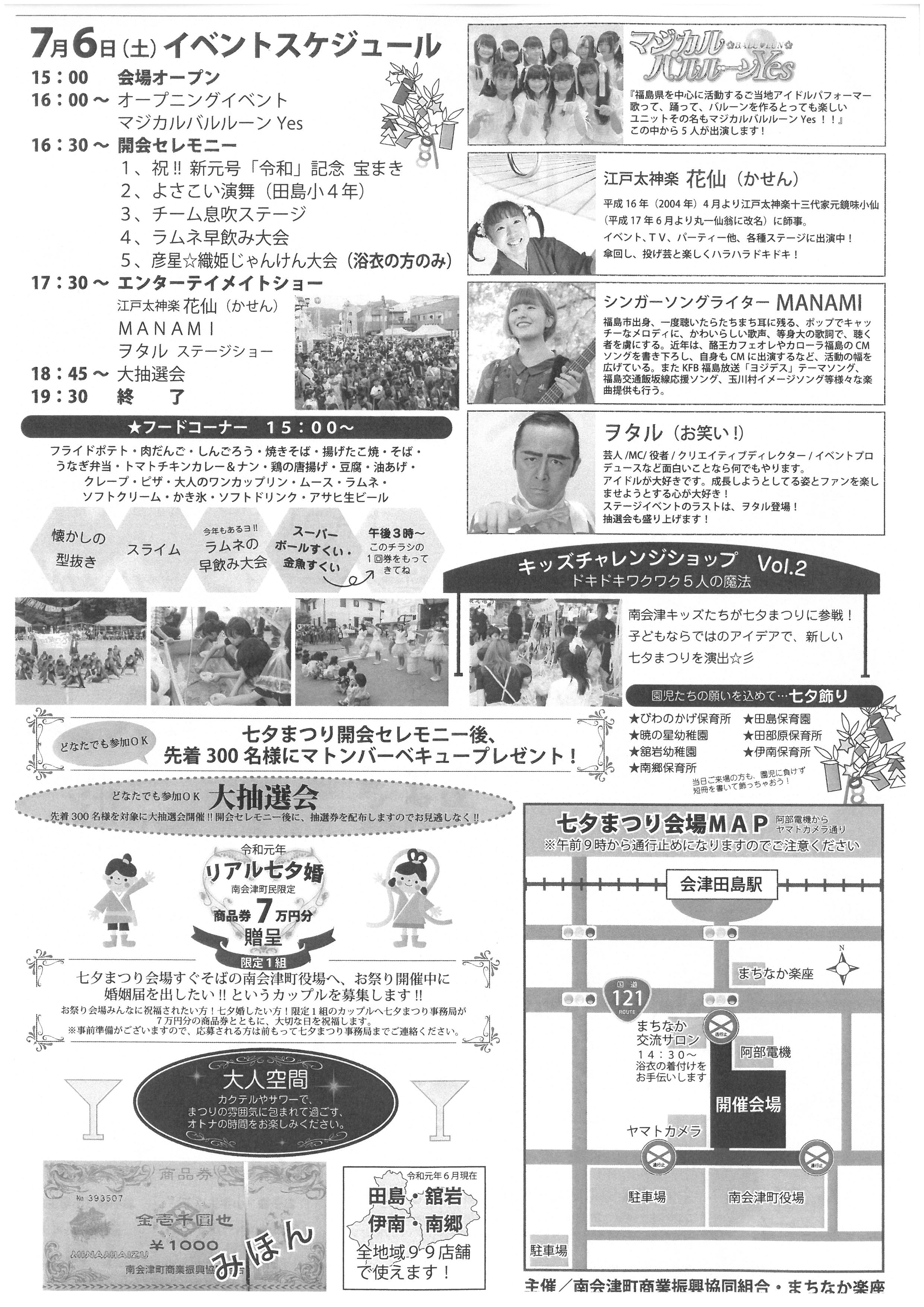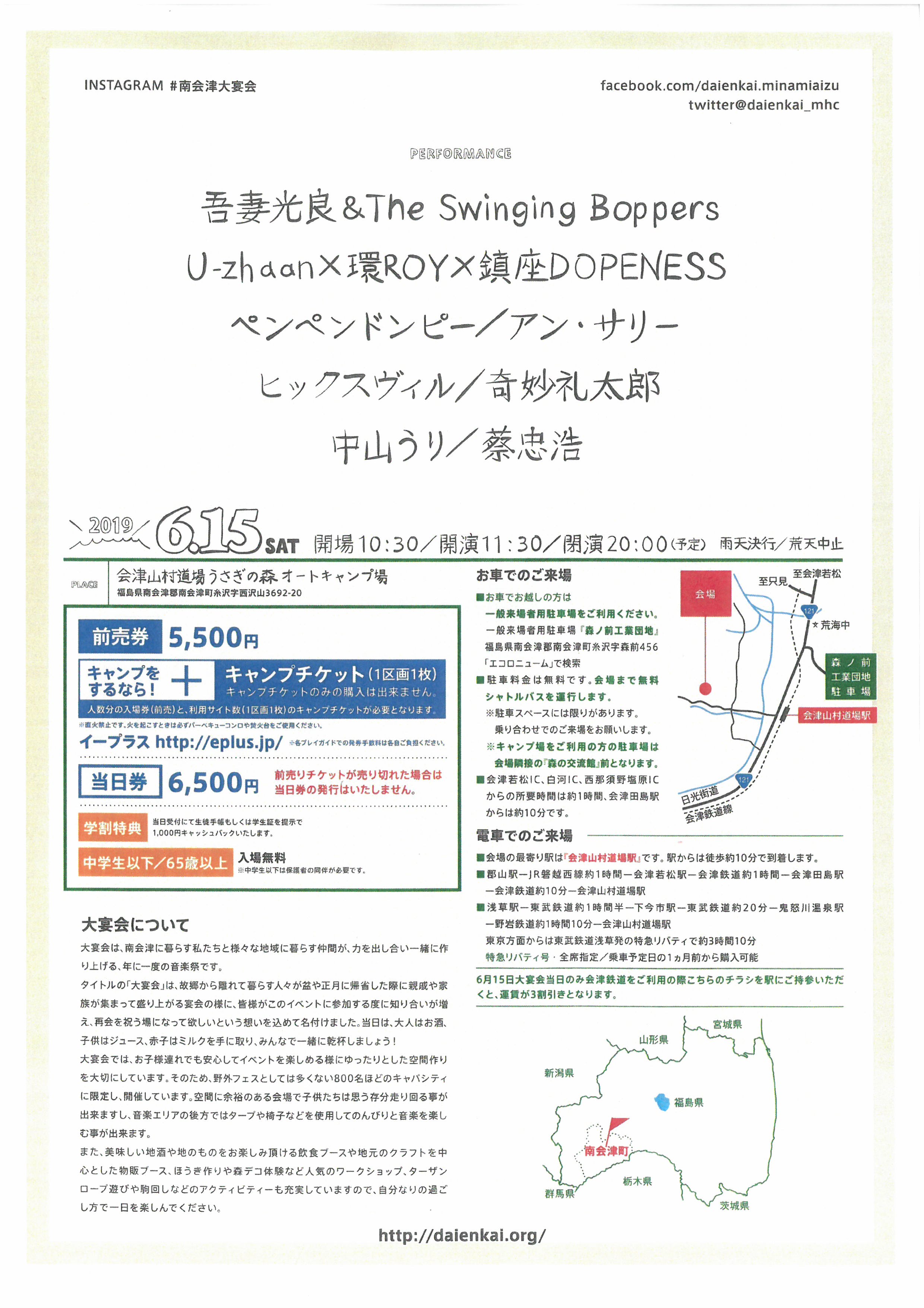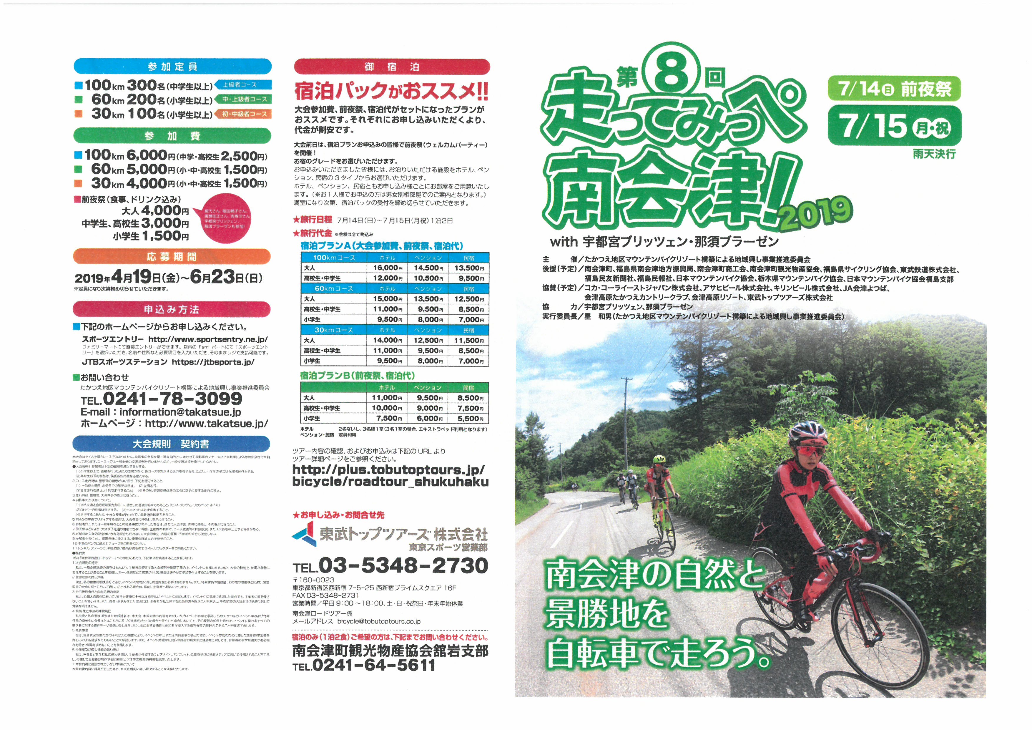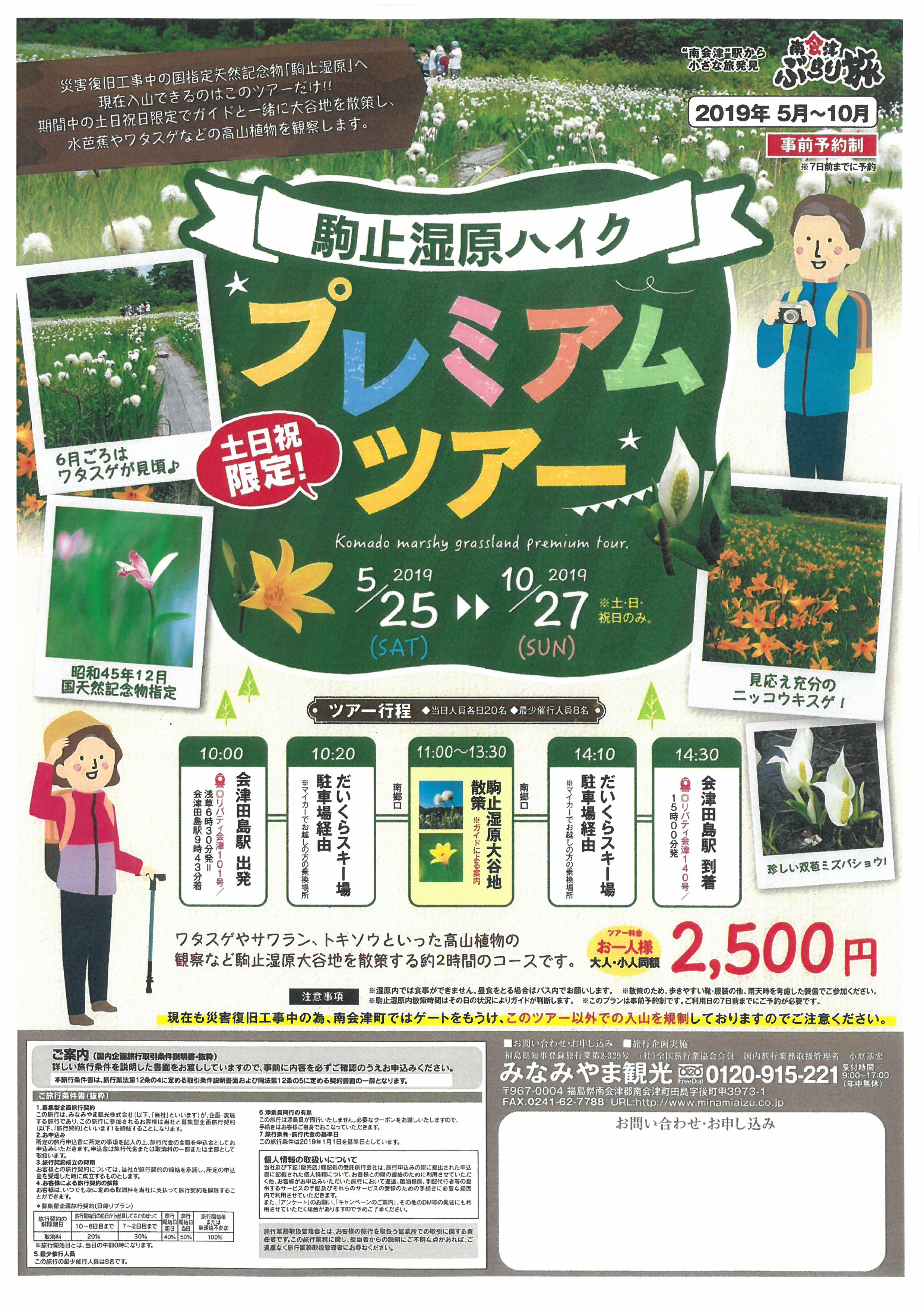 [PR] ×[PR]上記の広告は3ヶ月以上新規記事投稿のないブログに表示されています。新しい記事を書く事で広告が消えます。 駒止湿原ハイクのご案内 駒止湿原ハイク プレミアムツアー(土・日・祝限定) 5/25より始まりまして10/27までの土日祝のみで行っている駒止湿原ハイク。 現在、災害復旧工事中のため国指定天然記念物『駒止湿原』へ入山できるのは、このプレミアムツアーだけです!! ツアー料金はお一人様2,500円です。(大人・子供同じ) 事前予約制ですのでご注意してください 詳しくはチラシをご確認ください [0回]PR みちのく娘!南会津演歌まつり みちのく娘! ~南会津公演 南会津演歌まつり2019 ★日時 7月14日(日) 開場 午後1時 開演 午後1時半 ★会場 御蔵入交流館文化ホール ★入場料 全席指定 2,000円 素敵な時間をお過ごしください [0回] 七夕まつり☆彡 七夕まつり 7月6日(土) 午後3時より~ 先着300名様にマトンバーベキュープレゼント! 大抽選会も開催いたします (こちらも先着300名様になりますのでお早めに!!) フードコーナーにエンターテイメントショーも充実 令和元年記念で宝まきが開会セレモニー後行われます 浴衣特典もありますよ 園児たちの短冊が飾られてるので ぜひお子様のお願い事探してみてください [0回] 走ってみっぺ 南会津!2019 第8回 走ってみっぺ 南会津!2019 南会津の自然と景勝地を自転車で走ろう!! まもなく応募期限が迫っております 6月23日(日)まで 参加希望の方はお早めにお申し込みください 詳しくはチラシをご確認ください! [0回] 大宴会 in 南会津 南会津育ちの野外音楽フェスティバル 大宴会 in 南会津 * 2019年6月15日(日) * 南会津町糸沢 会津山村道場うさぎの森 オートキャンプ場にて * 11:30より開演いたします~ 今年は10周年 おいしい地酒や地元のごちそうをお楽しみいただける飲食ブース 地元のクラフトを中心とした物販ブース ほうき作りや森デコ体験などの人気ワークショップ ターザンロープ遊びや駒回しなどのアクティビティー などなど充実しております ぜひ自分なりの過ごし方で楽しい一日を [0回]